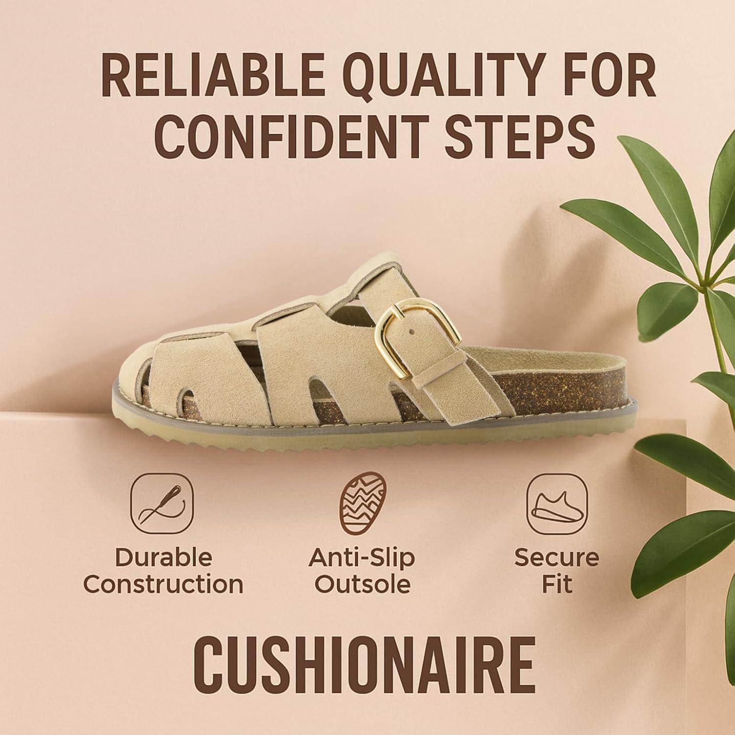 These CUSHIONAIRE Benson fisherman sandals for women, crafted for those who want breathable structure without sacrificing support. These suede sandals for women blend heritage design with modern performance, offering a closed toe sandals for women look that transitions effortlessly from day to night. As summer sandals for women 2025, they’re made for warmer days but built to last year-round. Designed for women who need both comfort and versatility, these womens sandals include features typically found in high-quality shoes for women, like supportive footbeds and soft, flexible uppers. The contoured cork footbed delivers the comfort similar to orthopedic sandals for women, providing gentle lift and stability for every stride. Thoughtfully styled as slip on sandals for women, they feature an adjustable buckle and open-weave design for a personalized fit that doesn’t compromise on security. Bringing the best of classic silhouettes and updated comfort, these clog sandals for women channel the charm of retro clogs for women in a breathable, woven suede finish. Whether you're reaching for black sandals women or other earthy hues like Taupe or Chestnut, they’ll pair effortlessly with your seasonal wardrobe. Performance-driven features include lightweight soles and built-in support, making them excellent sandals with arch support for all-day wear. With a supportive base and ease of movement, they double as dependable women's walking sandals. Their casual profile also aligns with the comfort and ease of flat sandals for women, ideal for warm weather adventures. Finished with materials seen in top-tier womens cork sandals, and shaped to feel like your favorite supportive sandals for women, these are designed with real motion in mind. Slip into the secure structure of ladies sandals closed toe, and enjoy the stylish charm of cute sandals for women made to move. These fashion-forward womens clogs combine everything you want in a sandal—style, structure, and serious comfort.