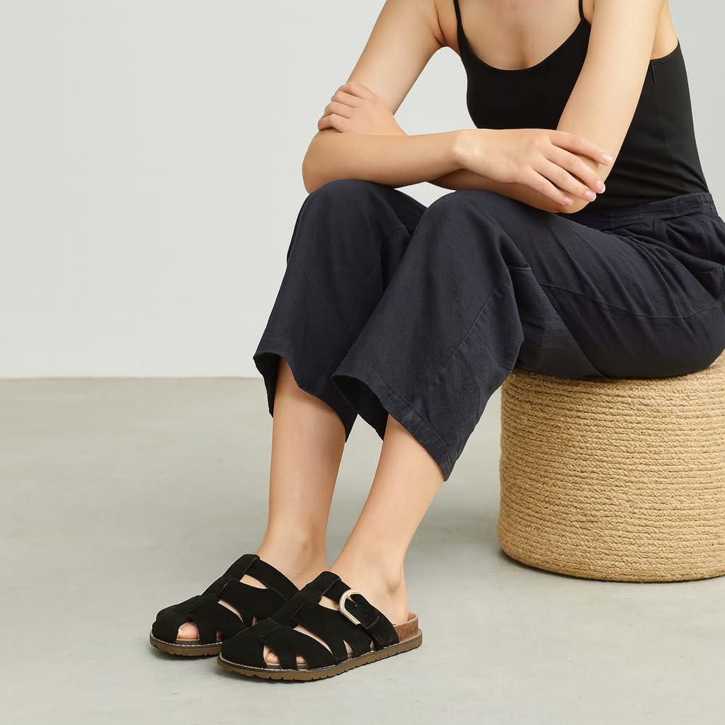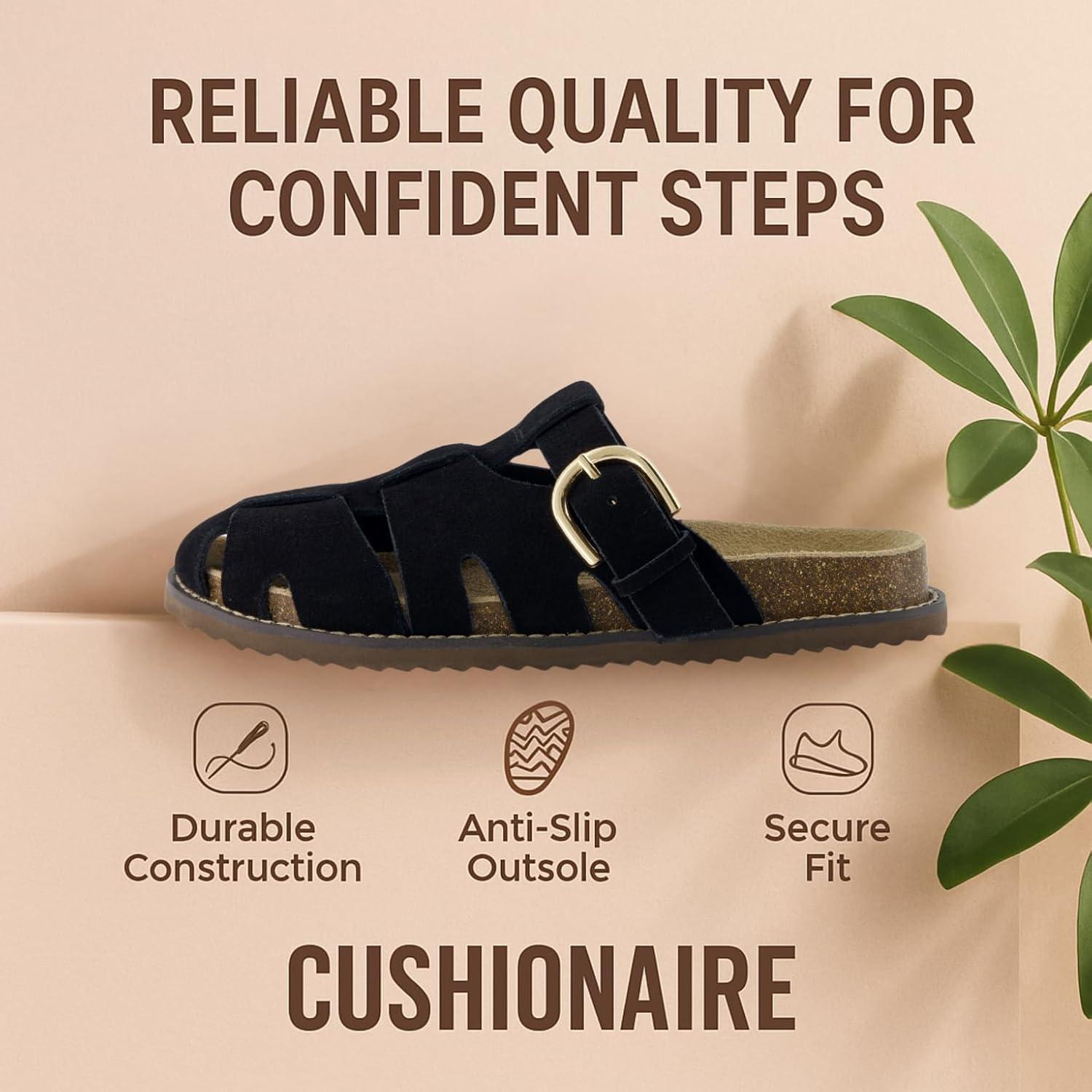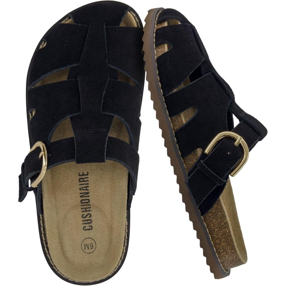 These CUSHIONAIRE Benson fisherman sandals for women, crafted for those who want breathable structure without sacrificing support. These suede sandals for women blend heritage design with modern performance, offering a closed toe sandals for women look that transitions effortlessly from day to night. As summer sandals for women 2025, they’re made for warmer days but built to last year-round. Designed for women who need both comfort and versatility, these womens sandals include features typically found in high-quality shoes for women, like supportive footbeds and soft, flexible uppers. The contoured cork footbed delivers the comfort similar to orthopedic sandals for women, providing gentle lift and stability for every stride. Thoughtfully styled as slip on sandals for women, they feature an adjustable buckle and open-weave design for a personalized fit that doesn’t compromise on security. Bringing the best of classic silhouettes and updated comfort, these clog sandals for women channel the charm of retro clogs for women in a breathable, woven suede finish. Whether you're reaching for black sandals women or other earthy hues like Taupe or Chestnut, they’ll pair effortlessly with your seasonal wardrobe. Performance-driven features include lightweight soles and built-in support, making them excellent sandals with arch support for all-day wear. With a supportive base and ease of movement, they double as dependable women's walking sandals. Their casual profile also aligns with the comfort and ease of flat sandals for women, ideal for warm weather adventures. Finished with materials seen in top-tier womens cork sandals, and shaped to feel like your favorite supportive sandals for women, these are designed with real motion in mind. Slip into the secure structure of ladies sandals closed toe, and enjoy the stylish charm of cute sandals for women made to move. These fashion-forward womens clogs combine everything you want in a sandal—style, structure, and serious comfort.