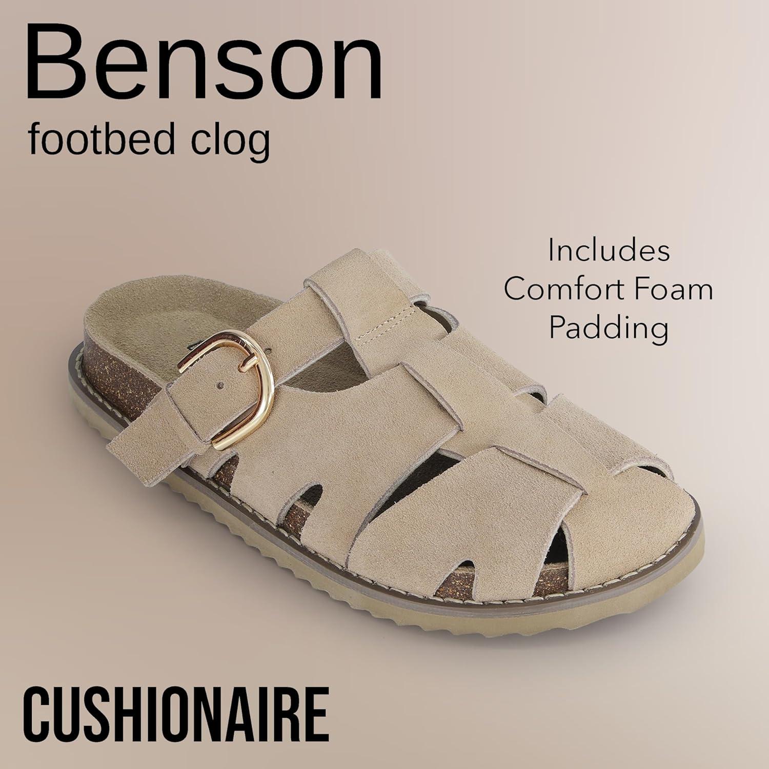 The CUSHIONAIRE Benson Women’s Fisherman Clog blends the heritage feel of a fisherman sandal with the ease of a modern clog. Featuring a woven suede upper and an adjustable buckle strap, this slip-on style offers both breathability and secure support. The contoured cork footbed molds to your foot over time, offering day-to-night comfort and natural arch support. With a lightweight, flexible outsole, Benson is ideal for everyday errands, weekend wear, or adding earthy charm to your casual wardrobe.