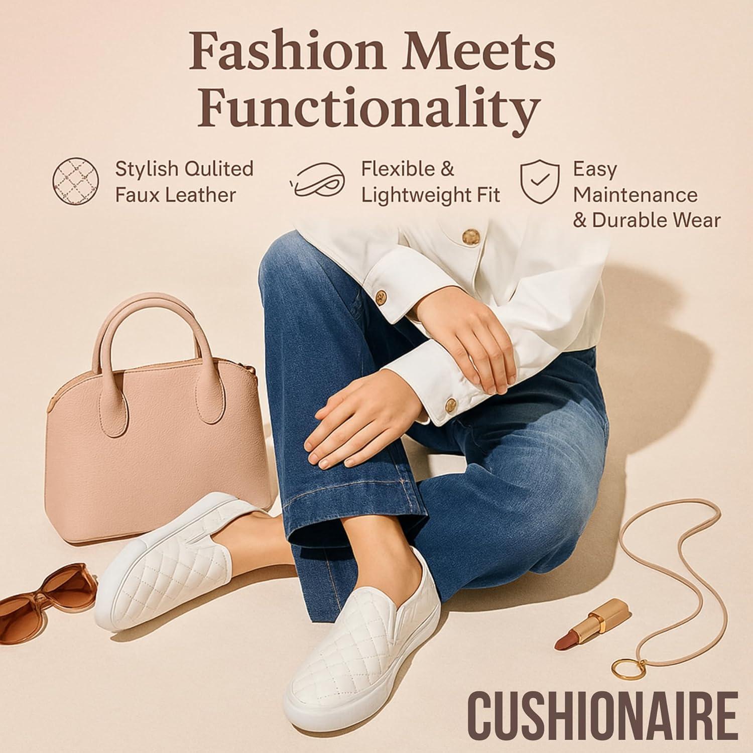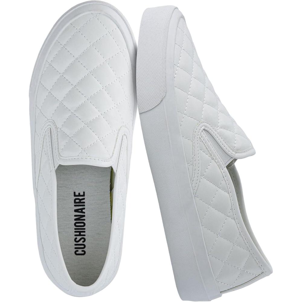 CUSHIONAIRE Faze Women’s Quilted Slip-On Sneaker – Faux Leather Casual Shoe with Memory Foam Insole & Rubber Outsole(White)