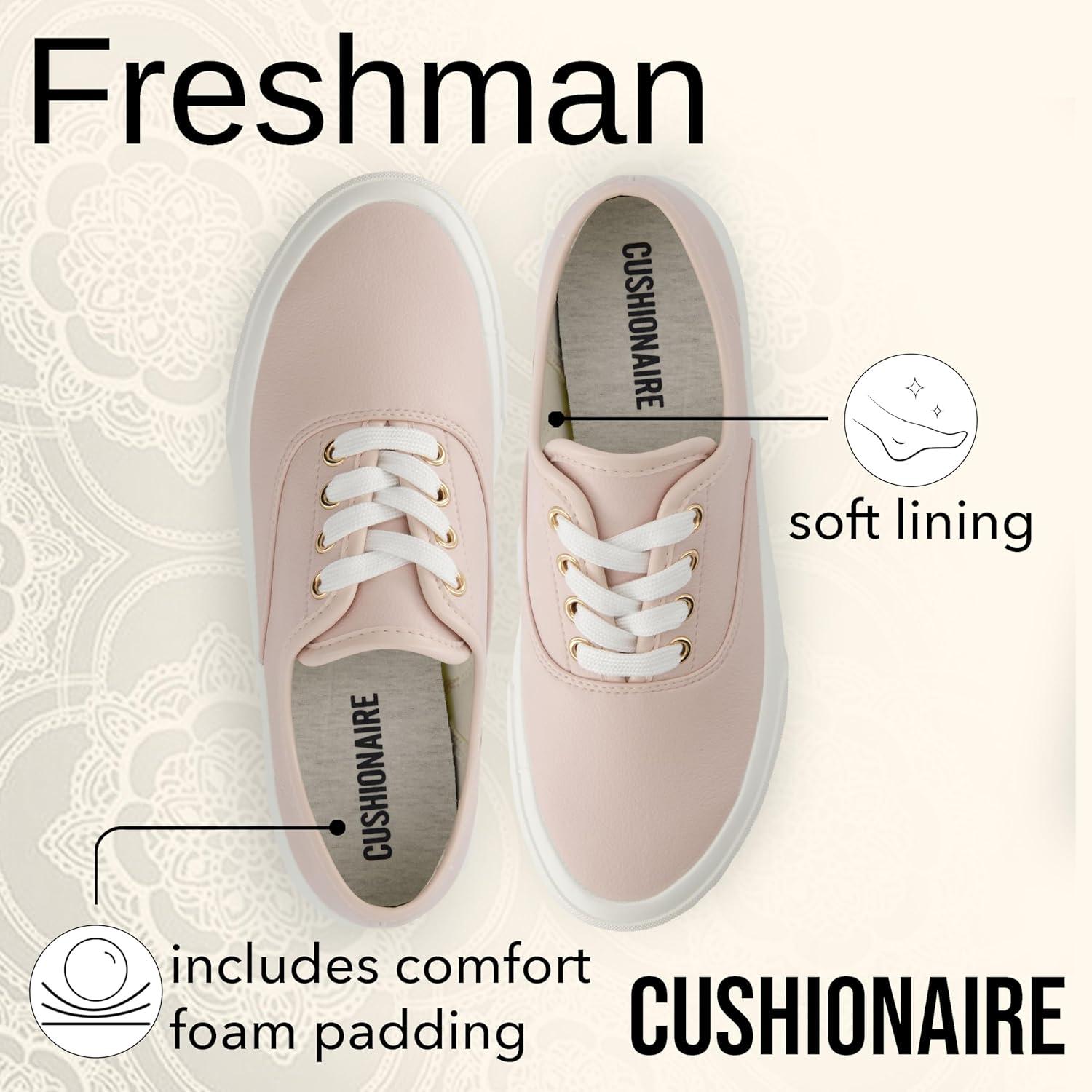 Step into timeless comfort with the CUSHIONAIRE Freshman womens canvas sneakers, designed for everyday versatility and effortless style. Featuring a cushioned insole and breathable upper, these sneakers combine comfort with a lightweight build, making them a reliable choice for walking, errands, or casual outings. These Freshman canvas shoes for women blend timeless styling with modern comfort, giving you versatile options for everyday wear. Designed as fashion sneakers with a clean, minimal look, they transition easily from casual outfits to more polished styles. The durable sole provides stability, creating non slip shoes you can rely on throughout your day. Whether you’re building a collection of womens shoes for work, weekends, or travel, these women's fashion sneakers deliver comfort without sacrificing style. Available in multiple stylish options including white sneakers for women, khaki, black, red, blush, blue, and white smooth finishes, these lace-up classics give you plenty of ways to match your look. Whether you’re after the crisp appeal of white canvas, the bold energy of red, or the soft elegance of blush, the Freshman sneaker delivers a color and texture for every mood. Perfect for pairing with jeans, dresses, or work outfits, these shoes bring durability and modern comfort together in a sleek design. The sturdy rubber sole offers traction and everyday reliability, while the simple silhouette keeps your look clean and versatile. From casual weekends to busy weekdays, the CUSHIONAIRE Freshman keeps you stylish, supported, and ready to go.