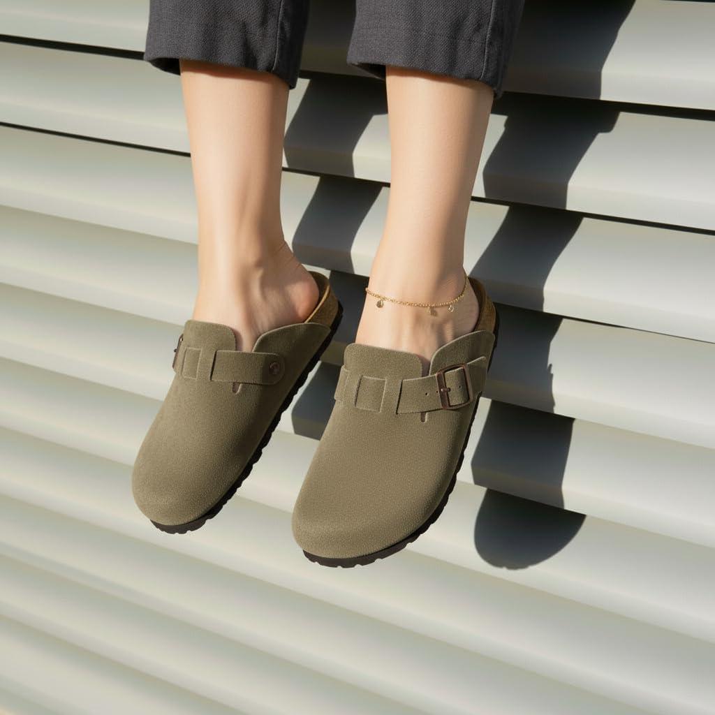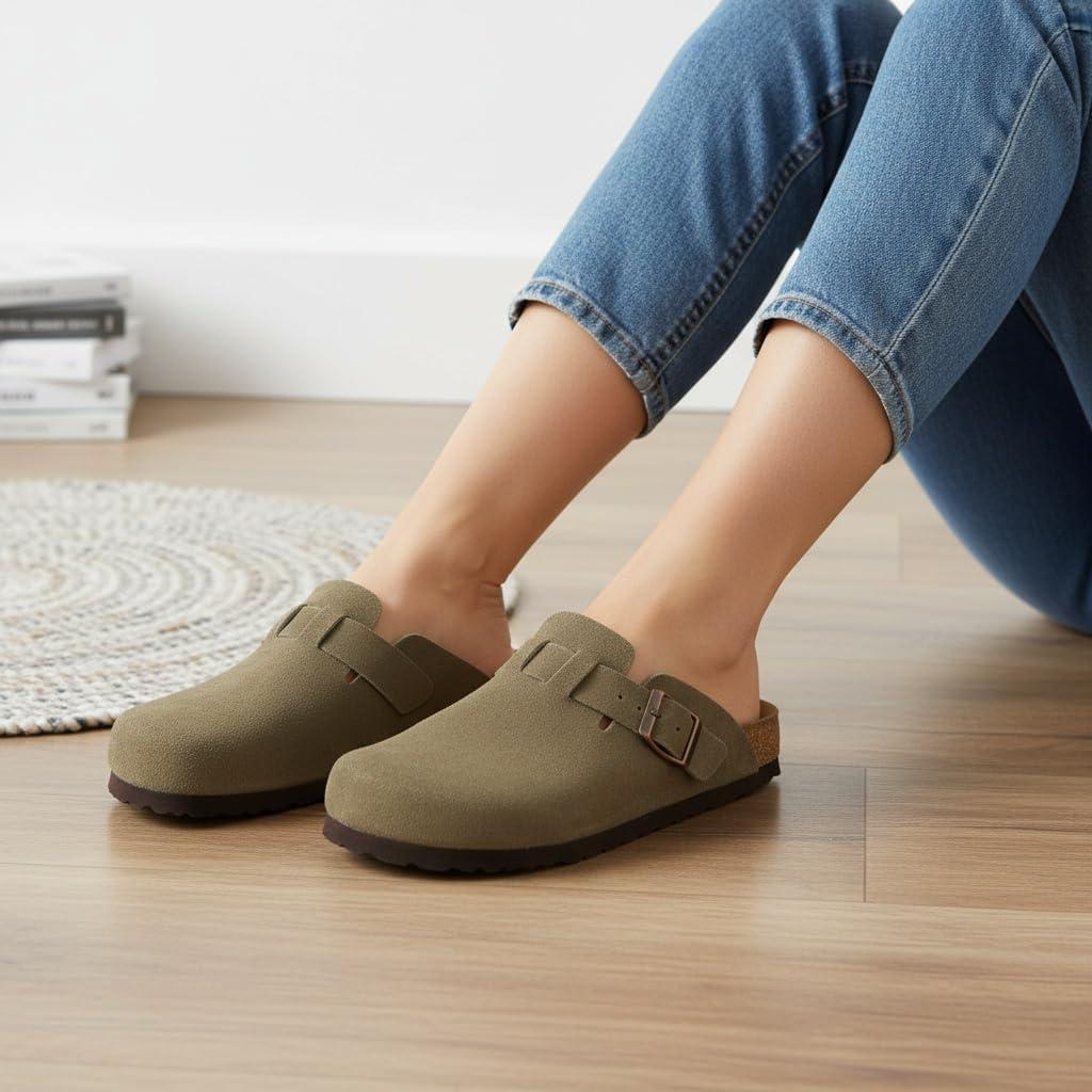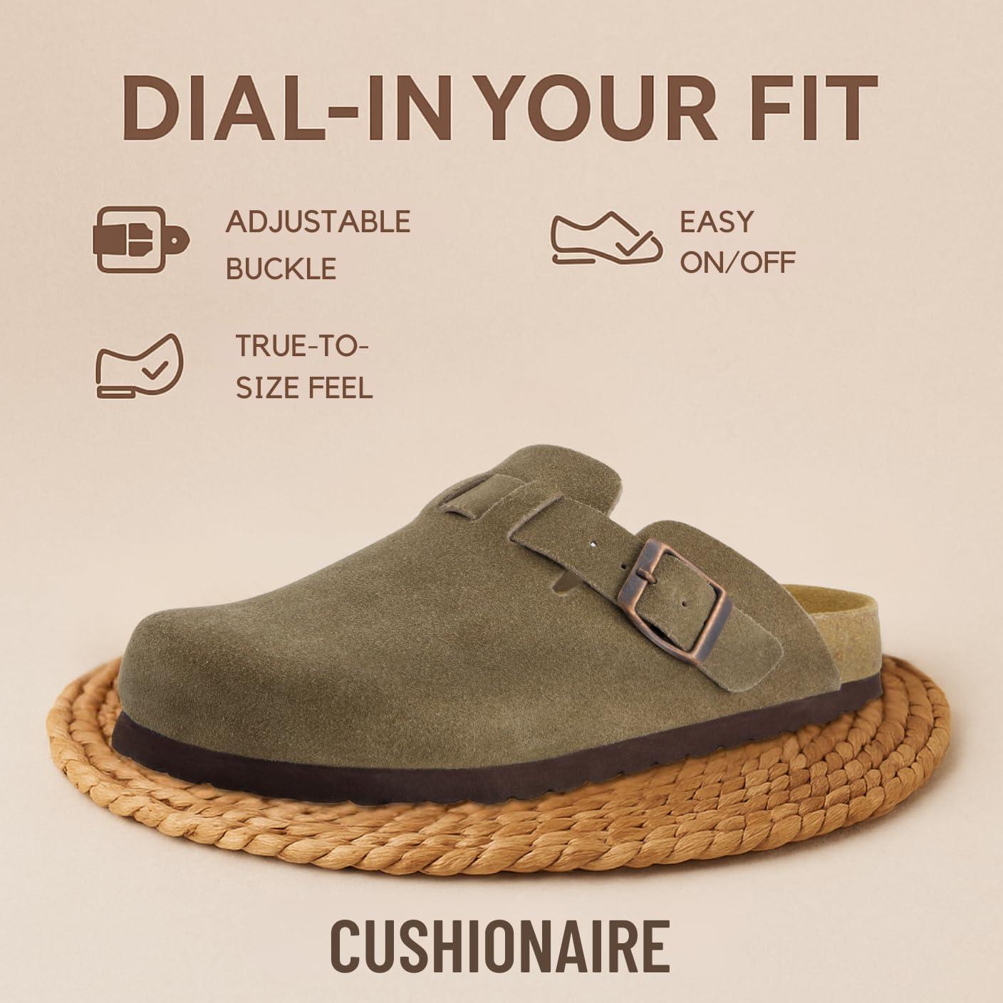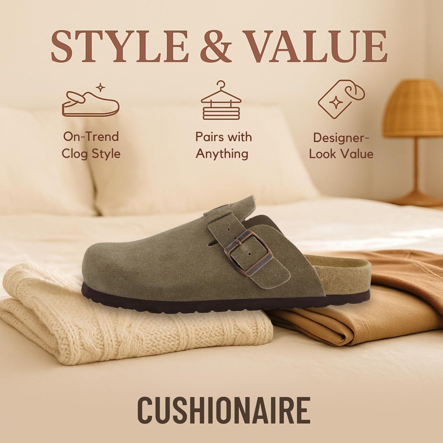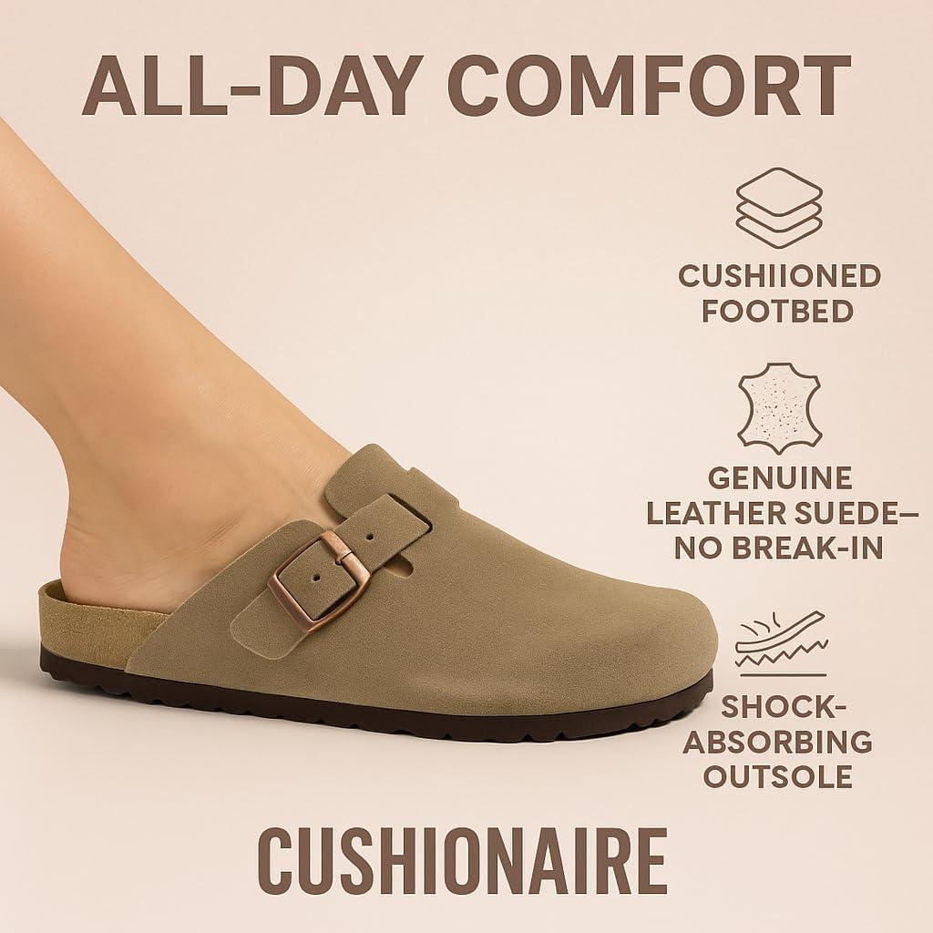 Step into comfort with the CUSHIONAIRE Hana, a versatile clog crafted from soft genuine suede. These suede clogs feature a contoured footbed that cushions every step, making them a reliable choice for work, errands, or evenings at home. The slip-on silhouette combines ease and support, giving you an effortless style that pairs with denim, trousers, or cozy layers. Designed for everyday wear, Hana works as both stylish womens mules and durable womens house shoes. The clean profile offers the coverage of closed toe sandals women can wear with ease, while still delivering the lightweight comfort of a mule. Quick to slip on, they provide the convenience of slip on slides for women with the polish of genuine suede craftsmanship. With a stable sole and roomy fit, they offer the comfort of slippers while maintaining structure for all-day use. The versatile outsole transitions easily from indoors to outdoors, so your comfort goes wherever you do. Whether styled as womens mules, relaxed womens house shoes, or classic suede clogs, Hana delivers lasting support and timeless appeal.