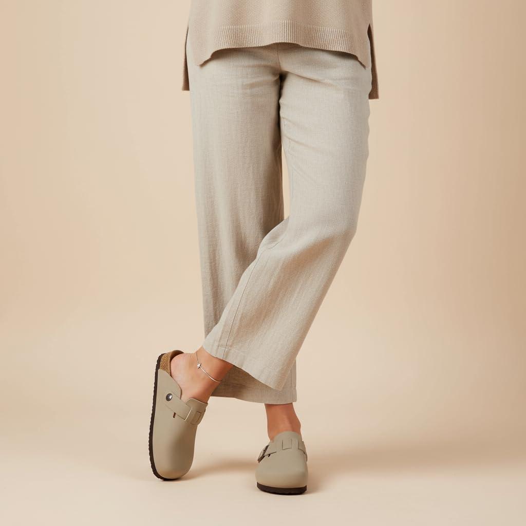 CUSHIONAIRE Hana Womens Clogs | Comfortable Vegan Suede Clogs for Women | Slip On Potato Shoes with Cork Footbed & Arch Support | Memory Foam, Wide Widths Available(Stone)