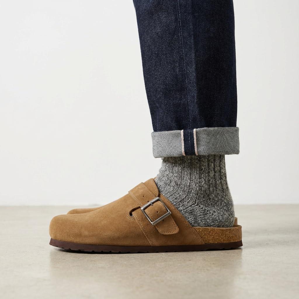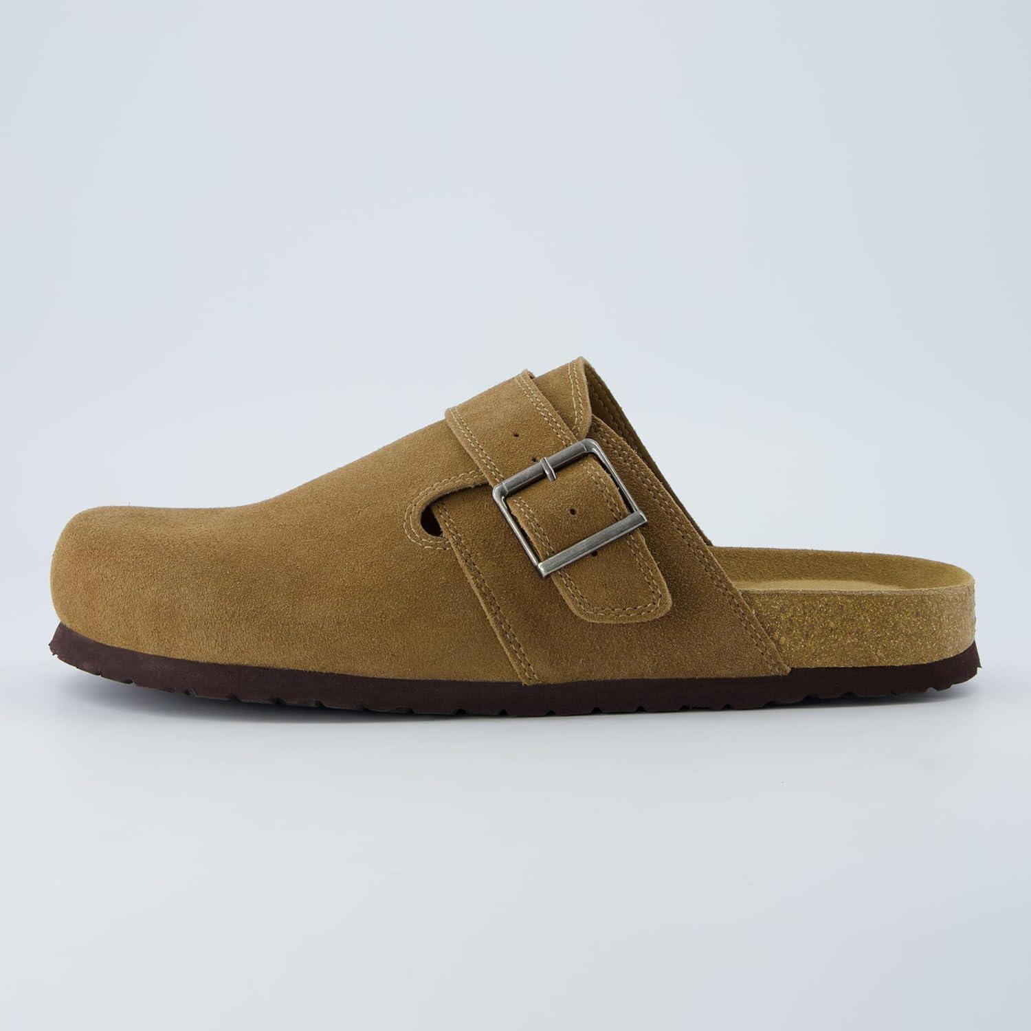 Experience easy comfort with these men’s suede clogs designed for everyday wear, blending the effortless feel of potato shoes with the practicality shoppers expect. Made with a genuine suede leather upper, they offer a soft, durable texture that forms naturally to your foot. The slip-on mule design makes them simple to step into, while the closed toe provides secure coverage for both indoor relaxation and quick outdoor errands. An adjustable buckle strap allows you to customize the fit, adding stability whether you wear them as mens clogs or dependable slippers for men around the house. A cushioned cork-blend footbed paired with memory foam delivers reliable arch support that keeps every step comfortable throughout the day. The lightweight, flexible outsole moves naturally with each stride, giving you traction without added bulk for a relaxed, easygoing feel. Perfect for men who want comfort without sacrificing style, these clogs transition effortlessly from home to casual outings. The lineup includes black clogs for a versatile everyday look, along with additional colors such as Brown, Olive, and Taupe.