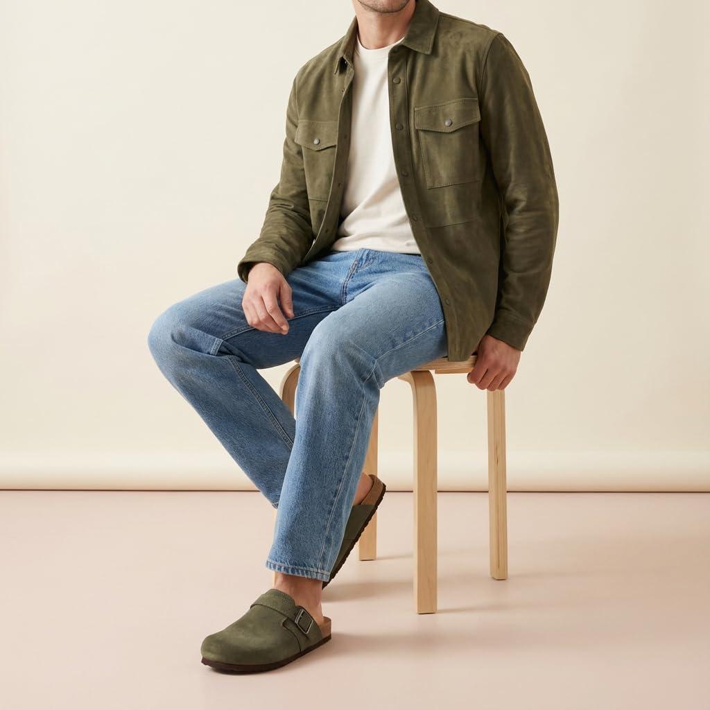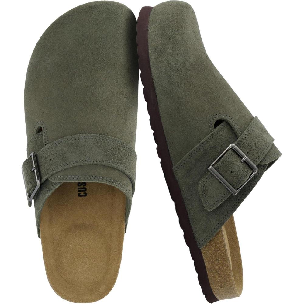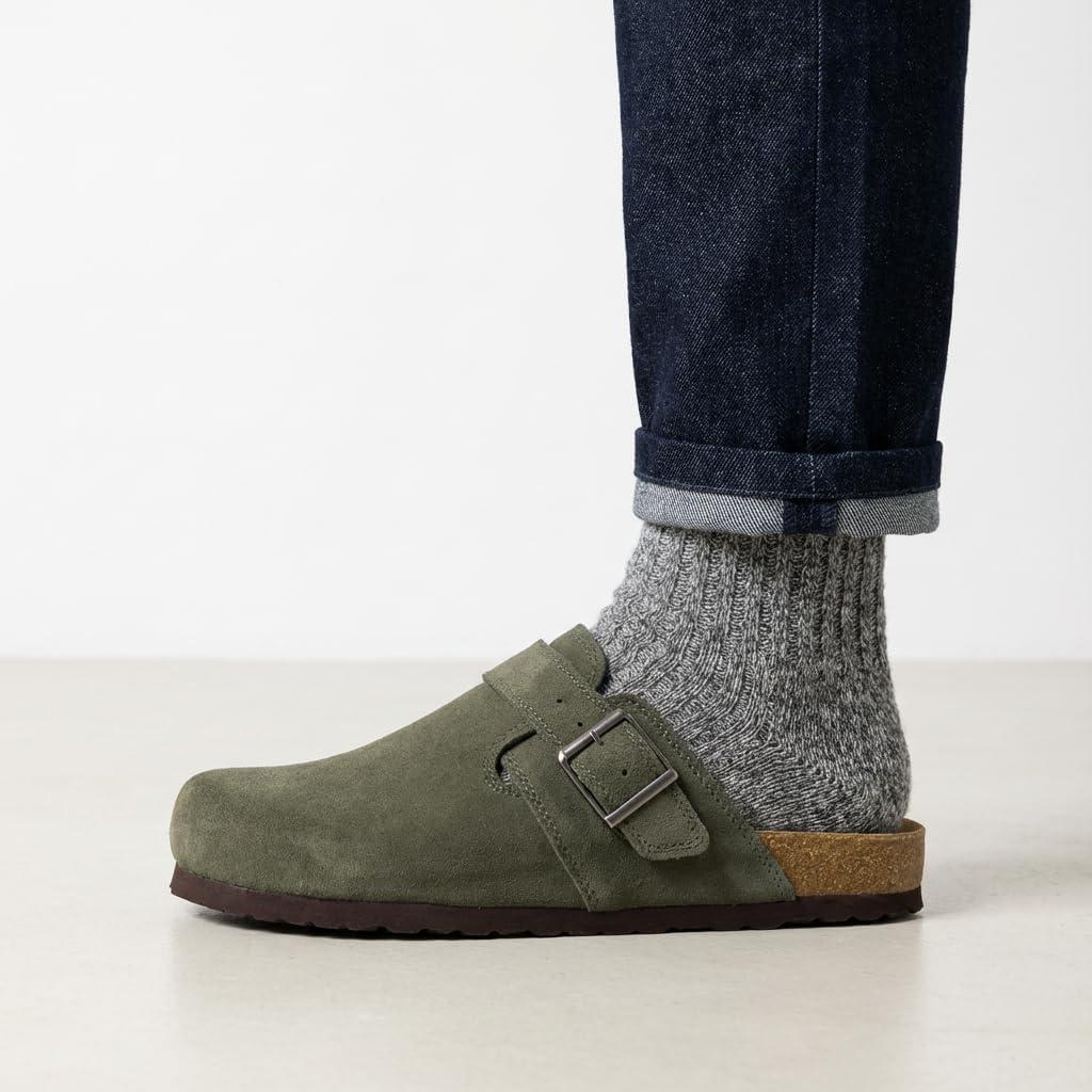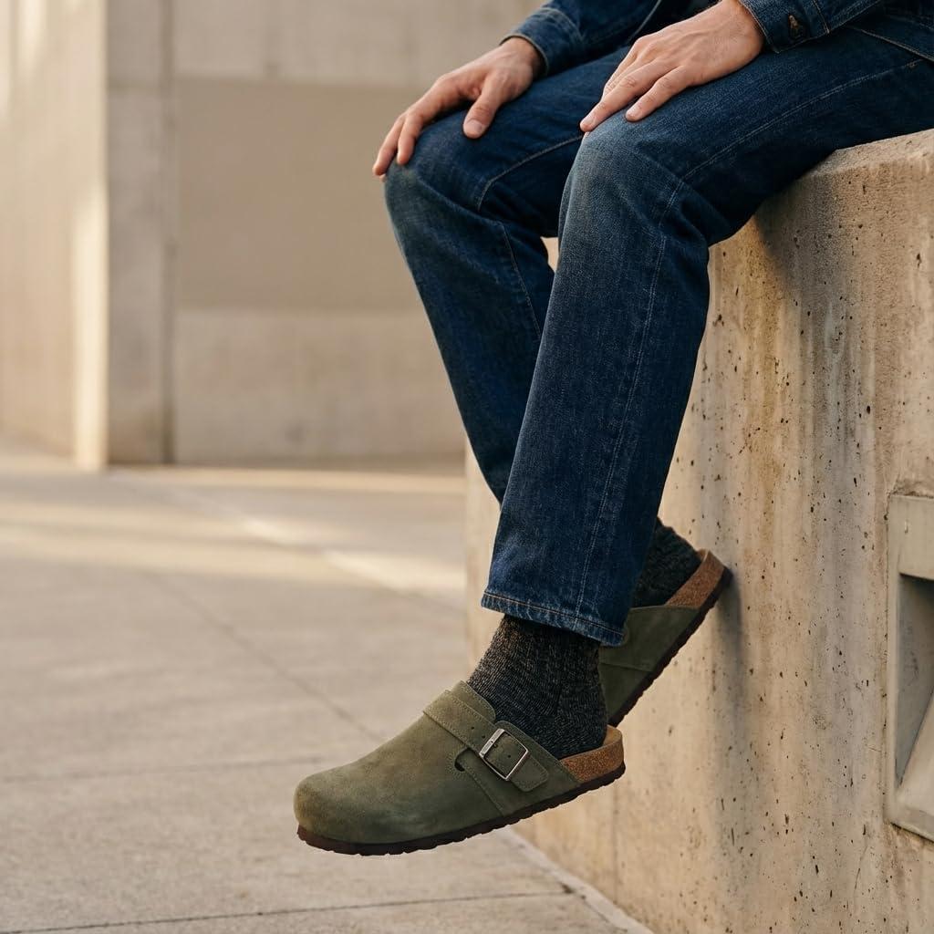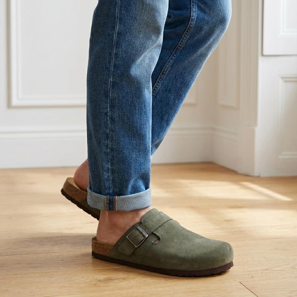 Experience easy comfort with these men’s suede clogs designed for everyday wear, blending the effortless feel of potato shoes with the practicality shoppers expect. Made with a genuine suede leather upper, they offer a soft, durable texture that forms naturally to your foot. The slip-on mule design makes them simple to step into, while the closed toe provides secure coverage for both indoor relaxation and quick outdoor errands. An adjustable buckle strap allows you to customize the fit, adding stability whether you wear them as mens clogs or dependable slippers for men around the house. A cushioned cork-blend footbed paired with memory foam delivers reliable arch support that keeps every step comfortable throughout the day. The lightweight, flexible outsole moves naturally with each stride, giving you traction without added bulk for a relaxed, easygoing feel. Perfect for men who want comfort without sacrificing style, these clogs transition effortlessly from home to casual outings. The lineup includes black clogs for a versatile everyday look, along with additional colors such as Brown, Olive, and Taupe.