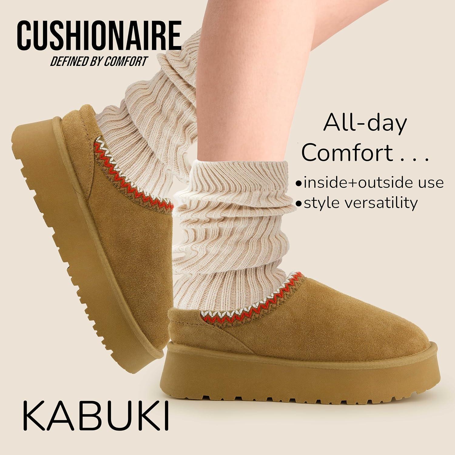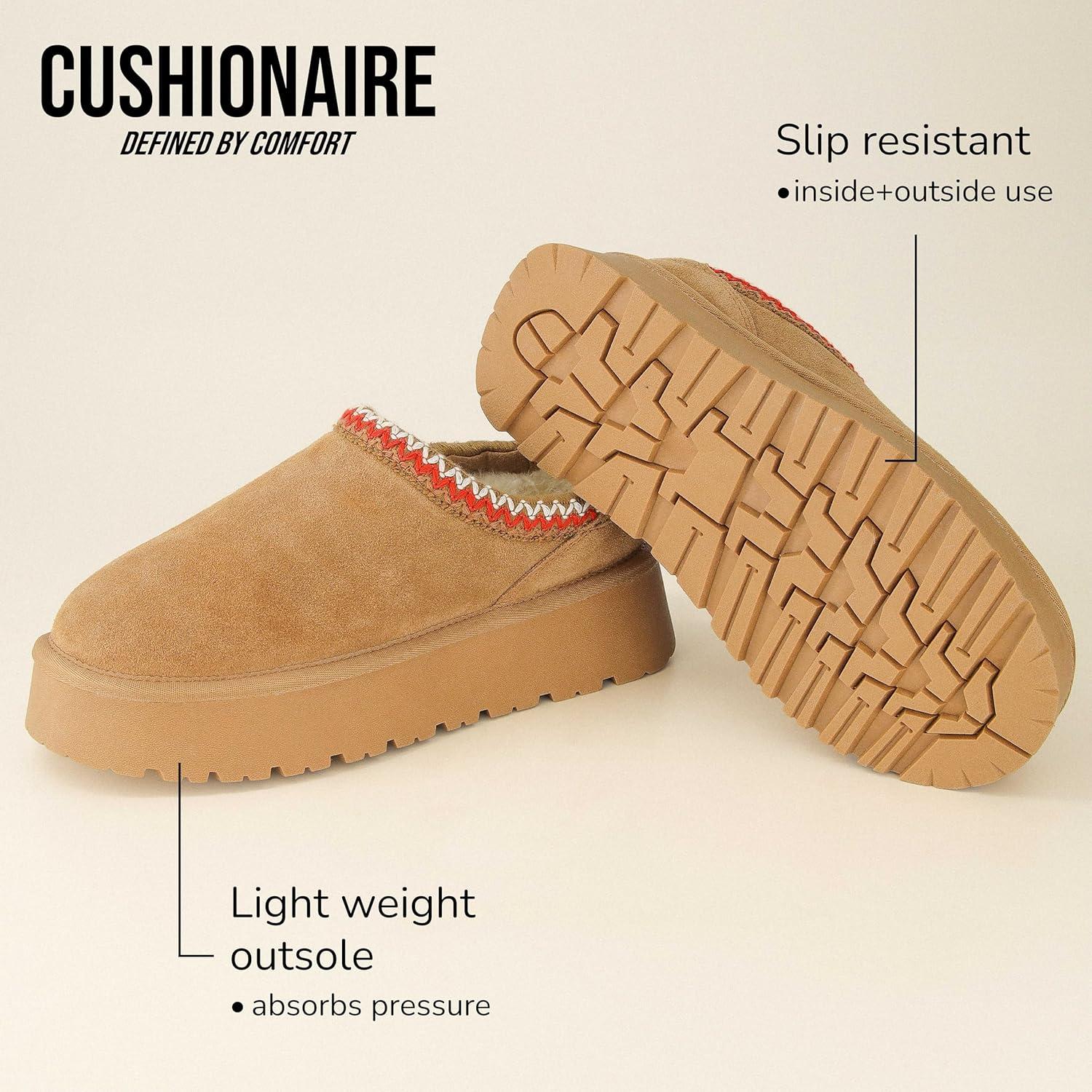 CUSHIONAIRE Kabuki Genuine Suede Cozy Mule Platform Slippers For Women. Whether you’re lounging at home or stepping out for errands, these fashionable slippers are designed to keep your feet warm, supported, and stylish. Made with genuine suede, the upper provides a premium look and feel, while ensuring long-lasting durability. These women’s slippers feature a cozy mule design, making them easy to slip on and off for ultimate convenience. The memory foam slippers for women are equipped with a plush memory foam insole that offers superior cushioning by molding to the shape of your foot. Whether you're wearing these as womens slippers size 8 platform or another size, you'll enjoy an ultra-comfy experience with every step. Designed with a modern platform sole, these slippers offer a trendy look while also providing added height and support. The soft faux-fur lining ensures your feet stay cozy and warm, making these black slippers for women a must-have for colder seasons. The combination of style and comfort makes these slippers perfect for lounging at home, working from your home office, or even taking quick trips outside. With a durable, non-slip rubber outsole, these platform slippers for women ensure stability on various indoor and outdoor surfaces. Whether you're walking on hardwood floors, tiles, or pavement, the sturdy sole provides reliable grip and traction. Available in various sizes, including womens slippers size 8 platform, these slippers make an excellent gift for loved ones or a well-deserved treat for yourself. Choose from versatile colors like black slippers to match your style effortlessly. Pair them with your favorite loungewear, pajamas, or casual outfits for a cozy, relaxed look. Elevate your at-home footwear game with the Kabuki Genuine Suede Cozy Mule Slippers, combining premium materials, cozy warmth, and stylish design. Whether you’re relaxing indoors or making a quick trip outside, these slippers offer cozy warmth.