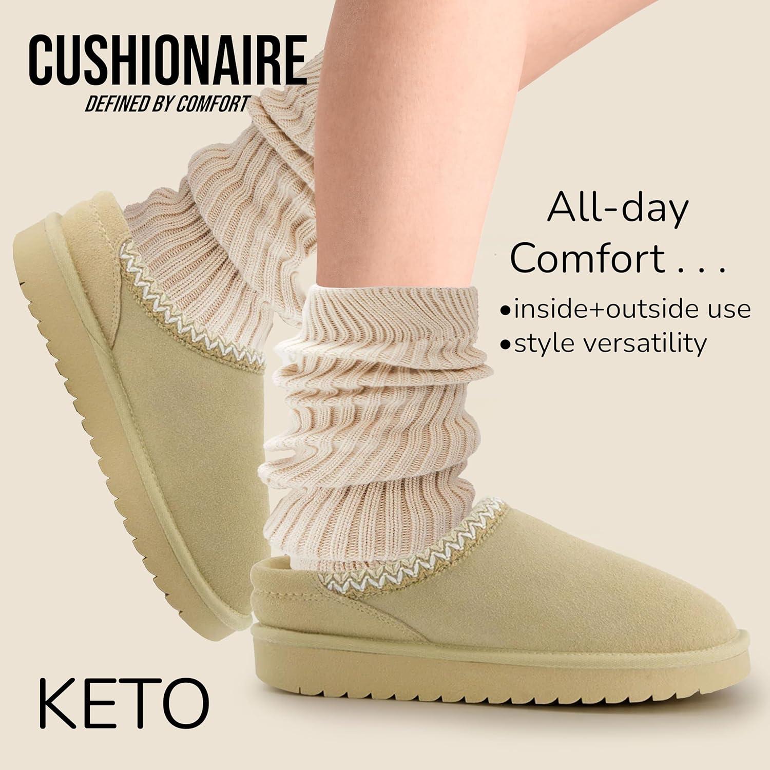 Slip into comfort with the CUSHIONAIRE Women's Keto Slip-On Suede Mule Slipper, designed for ultimate relaxation and style. Made from soft, premium suede with a chic zigzag stitch, these slippers combine coziness with a fashionable look. The cozy faux fur lining keeps your feet warm, making them perfect for colder weather. The memory foam insole molds to your feet for all-day comfort, while the durable rubber sole provides excellent grip and stability, ideal for both indoor and outdoor wear. Perfect for casual lounging or quick errands, these slippers offer both support and style. Available in wide widths for a customized fit. Treat your feet to everyday luxury and enjoy unmatched comfort in every step.