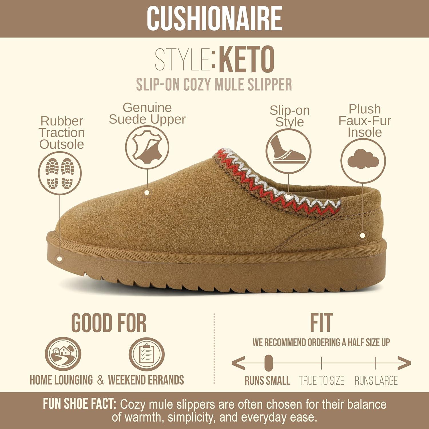 Slip into comfort with the CUSHIONAIRE Women's Keto Slip-On Suede Mule Slipper, designed for ultimate relaxation and style. Made from soft, premium suede with a chic zigzag stitch, these slippers combine coziness with a fashionable look. The cozy faux fur lining keeps your feet warm, making them perfect for colder weather. The memory foam insole molds to your feet for all-day comfort, while the durable rubber sole provides excellent grip and stability, ideal for both indoor and outdoor wear. Perfect for casual lounging or quick errands, these slippers offer both support and style. Available in wide widths for a customized fit. Treat your feet to everyday luxury and enjoy unmatched comfort in every step.