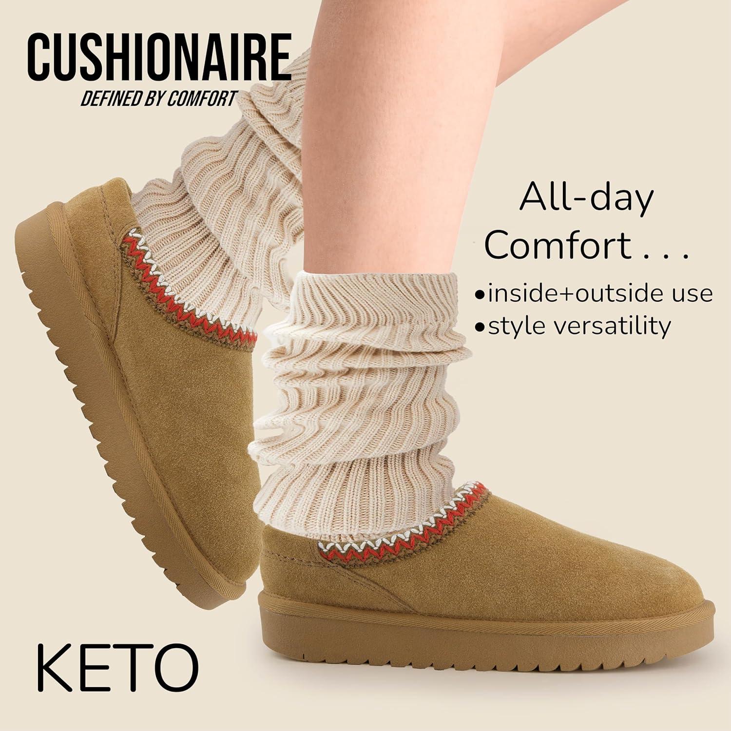 Slip into comfort with the CUSHIONAIRE Women's Keto Slip-On Suede Mule Slipper, designed for ultimate relaxation and style. Made from soft, premium suede with a chic zigzag stitch, these slippers combine coziness with a fashionable look. The cozy faux fur lining keeps your feet warm, making them perfect for colder weather. The memory foam insole molds to your feet for all-day comfort, while the durable rubber sole provides excellent grip and stability, ideal for both indoor and outdoor wear. Perfect for casual lounging or quick errands, these slippers offer both support and style. Available in wide widths for a customized fit. Treat your feet to everyday luxury and enjoy unmatched comfort in every step.