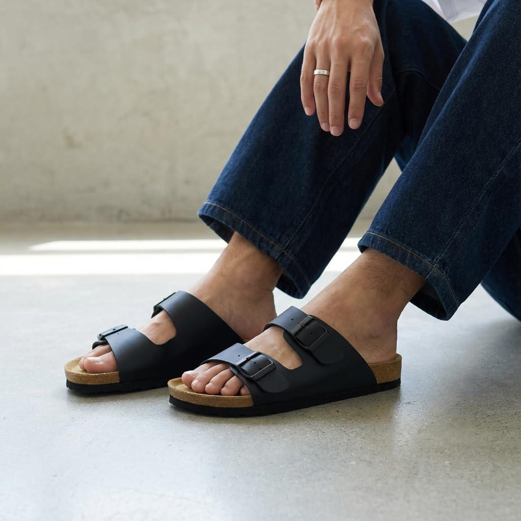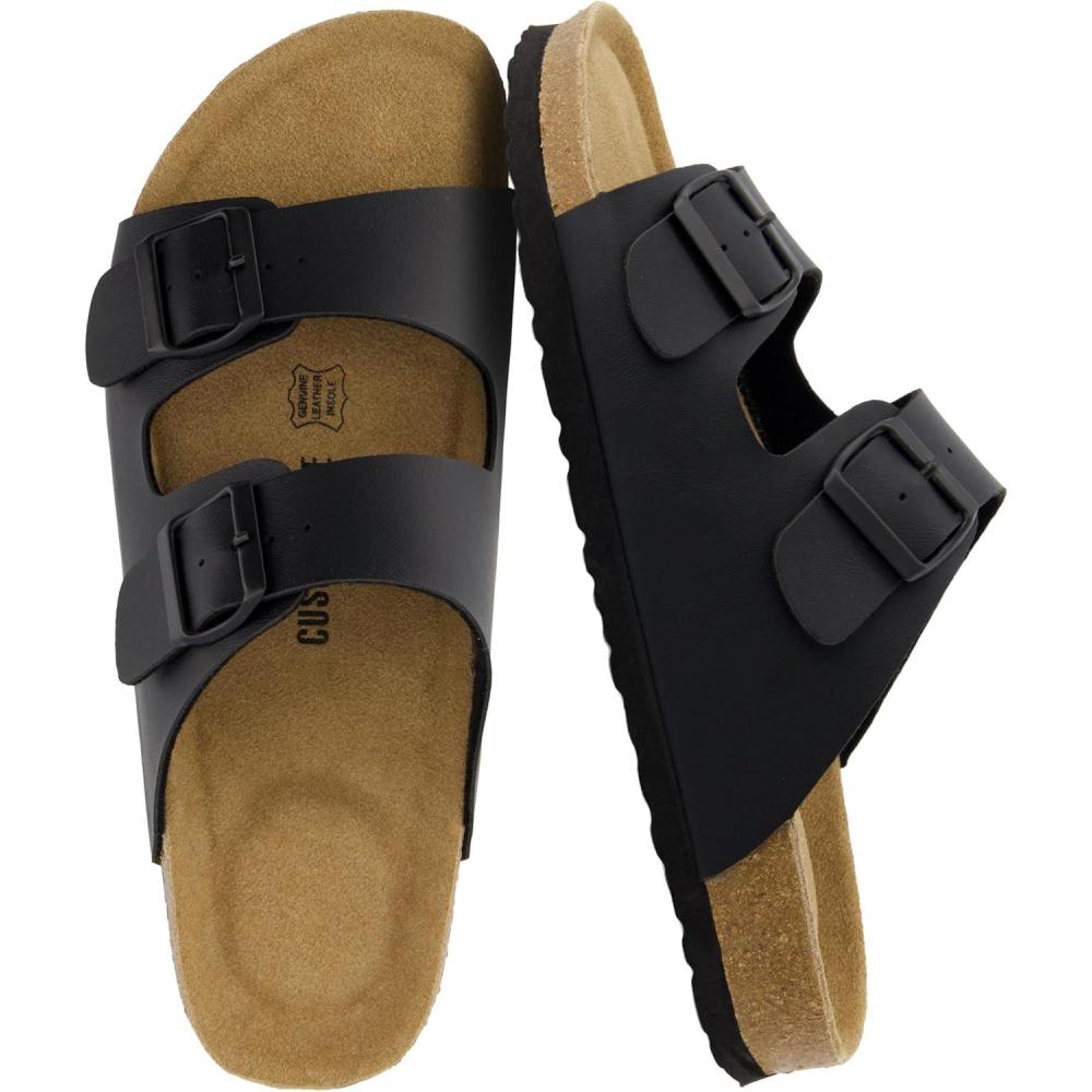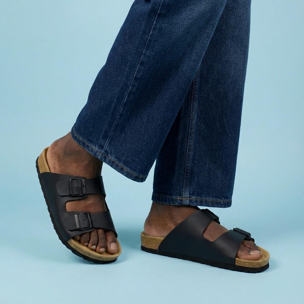 CUSHIONAIRE Lane Cork Footbed Mens Sandals, Adjustable Buckle Comfort Slides for Men, Genuine Leather Insole Summer Sandals Men Footwear(Black Nappa)