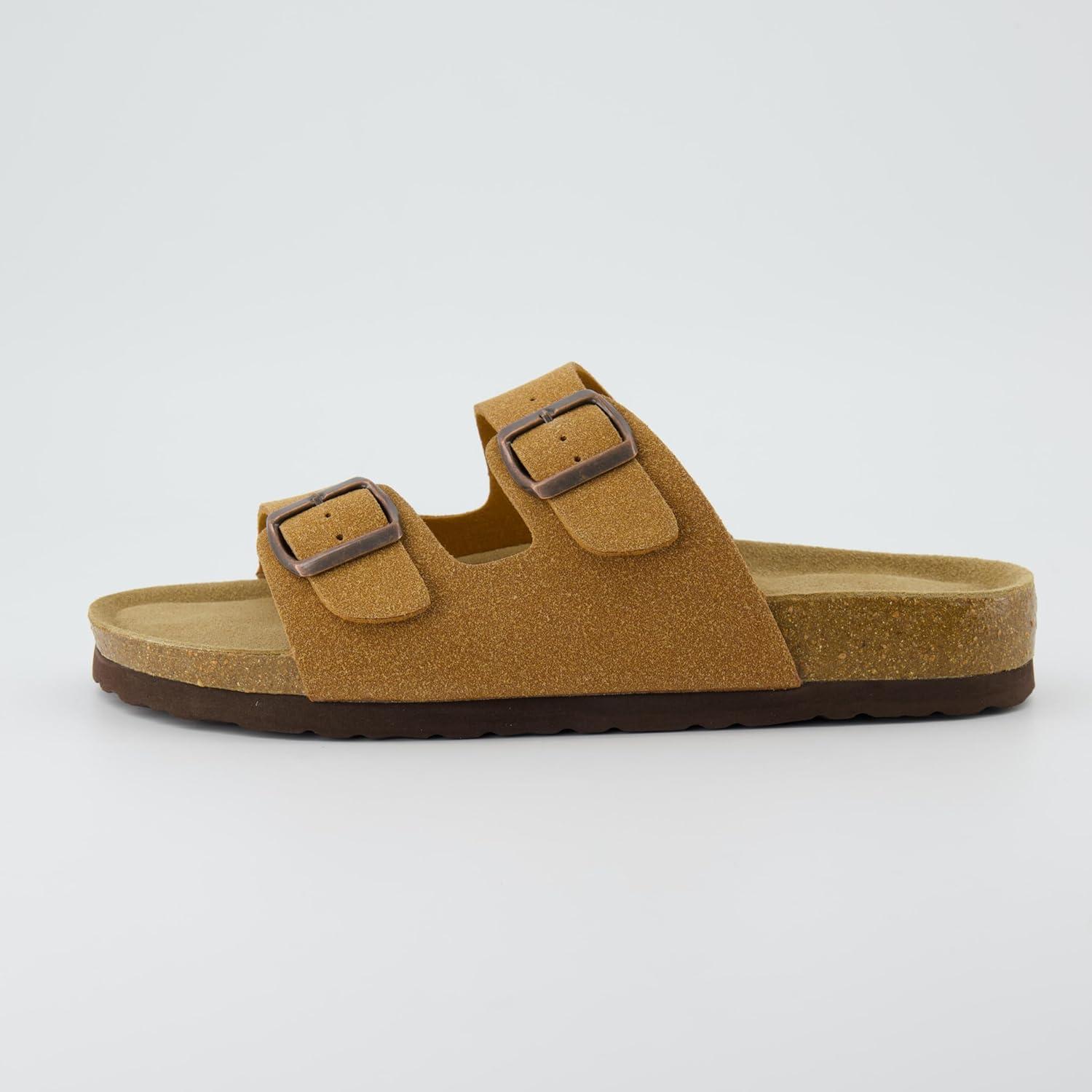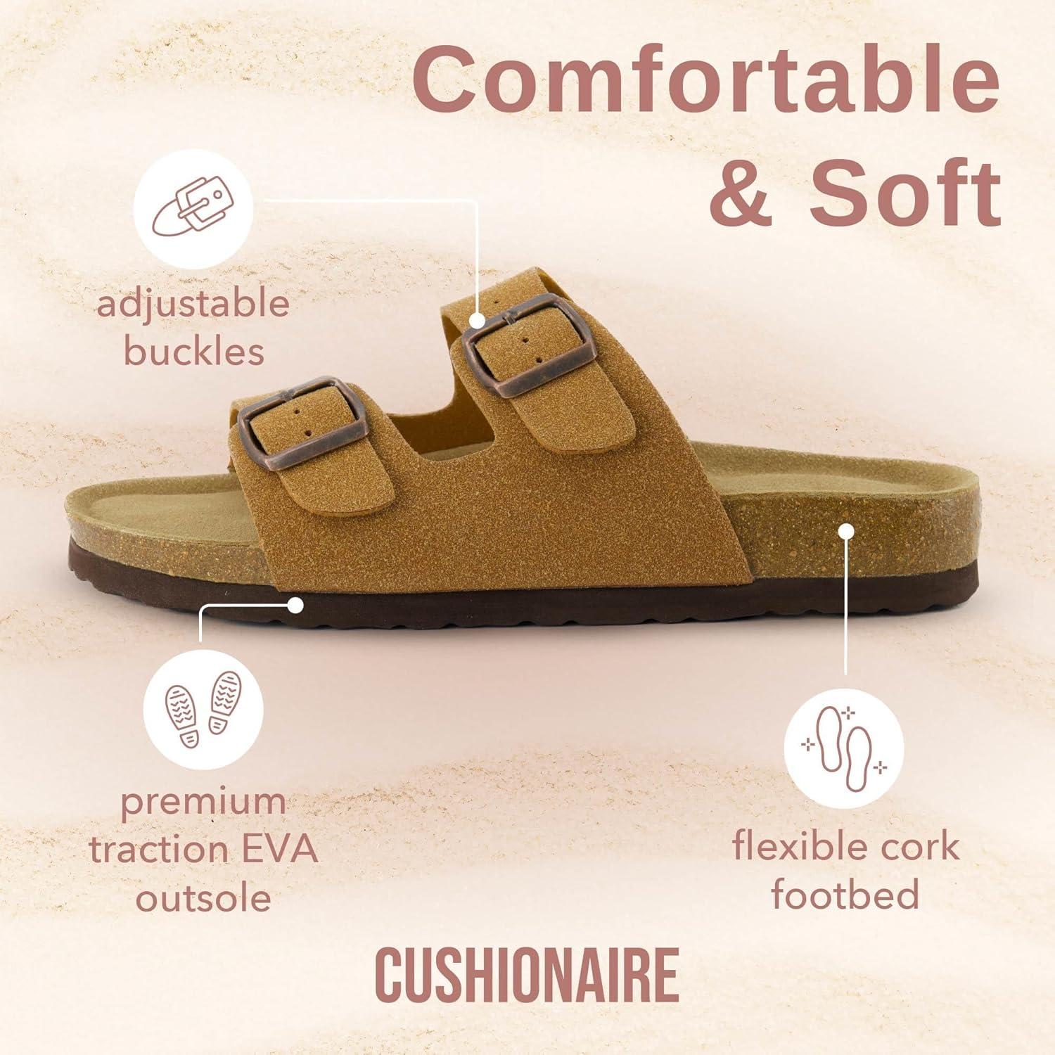CUSHIONAIRE Lane Cork Footbed Sandals for Women – Comfortable Double Buckle Slip-On with Genuine Suede Footbed & Arch Support Slides for Women Footwear(Tan Vegan Suede)