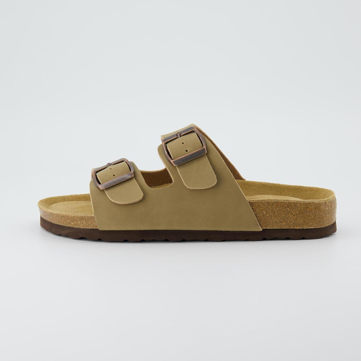 CUSHIONAIRE Lane Cork Footbed Sandals for Women – Comfortable Double Buckle Slip-On with Genuine Suede Footbed & Arch Support Slides for Women Footwear(Stone)