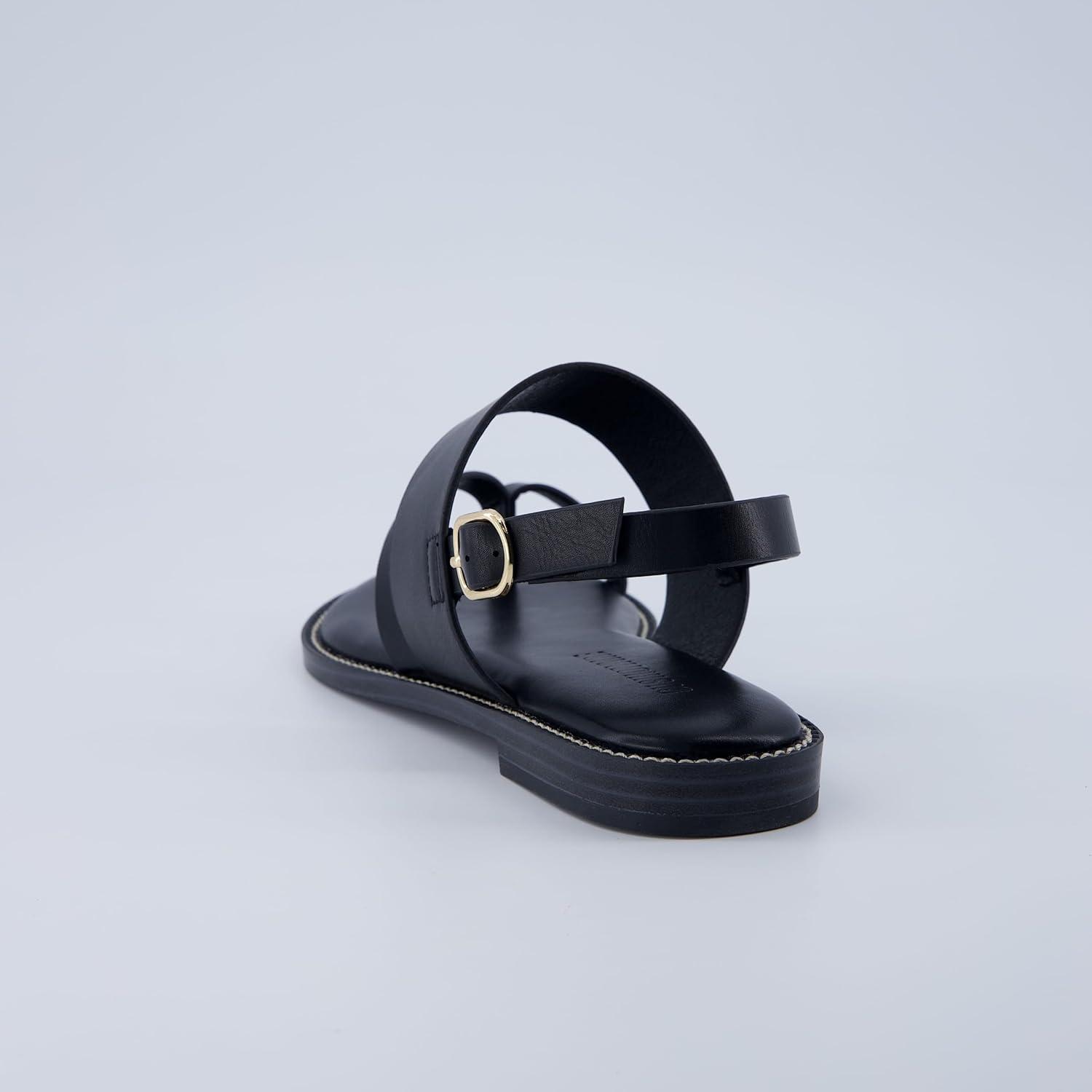 CUSHIONAIRE Leader Women’s Strappy Sandal – Premium Faux Leather Toe Loop Flat with Adjustable Ankle Strap & Cushioned Footbed(Black)