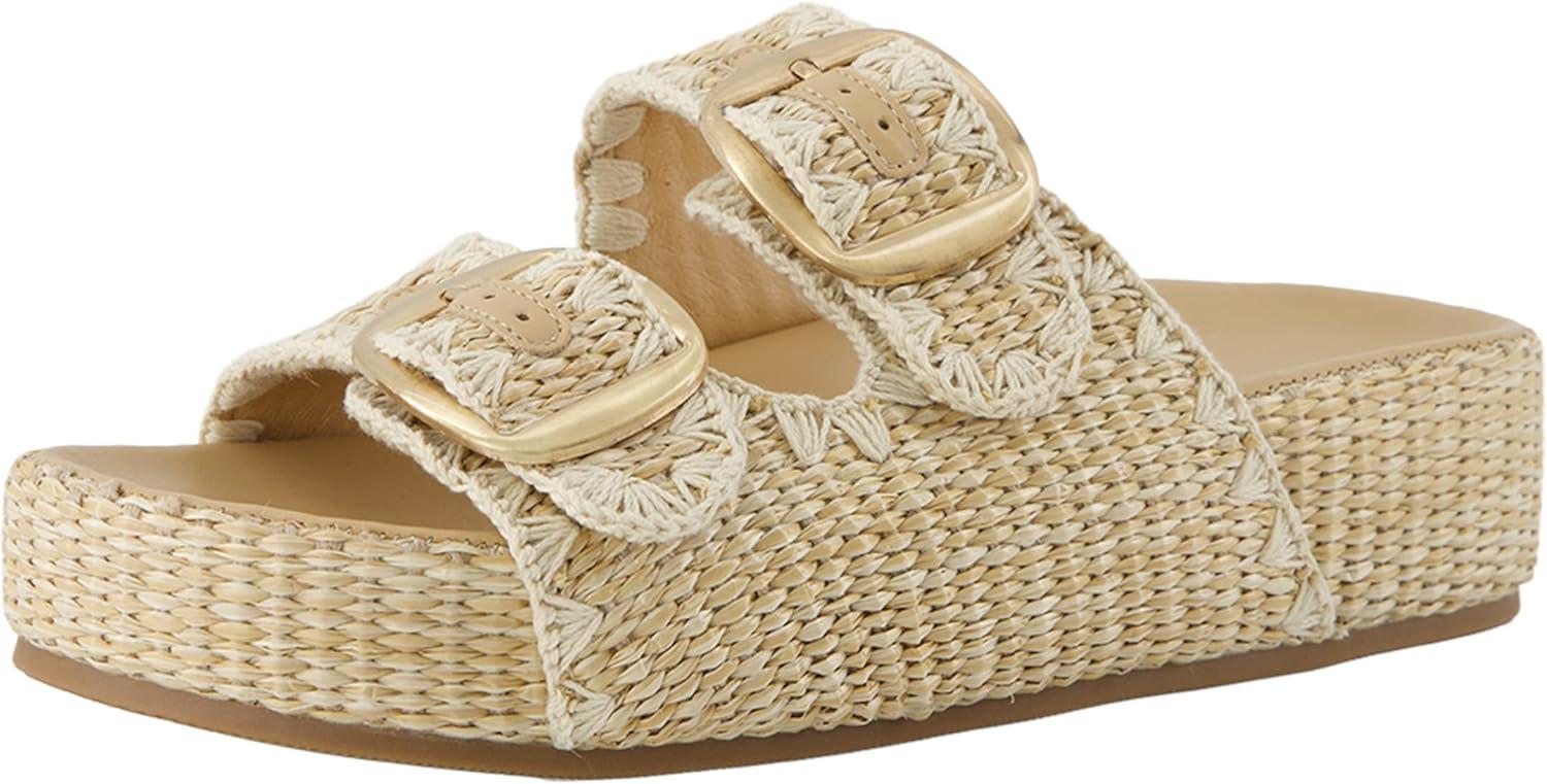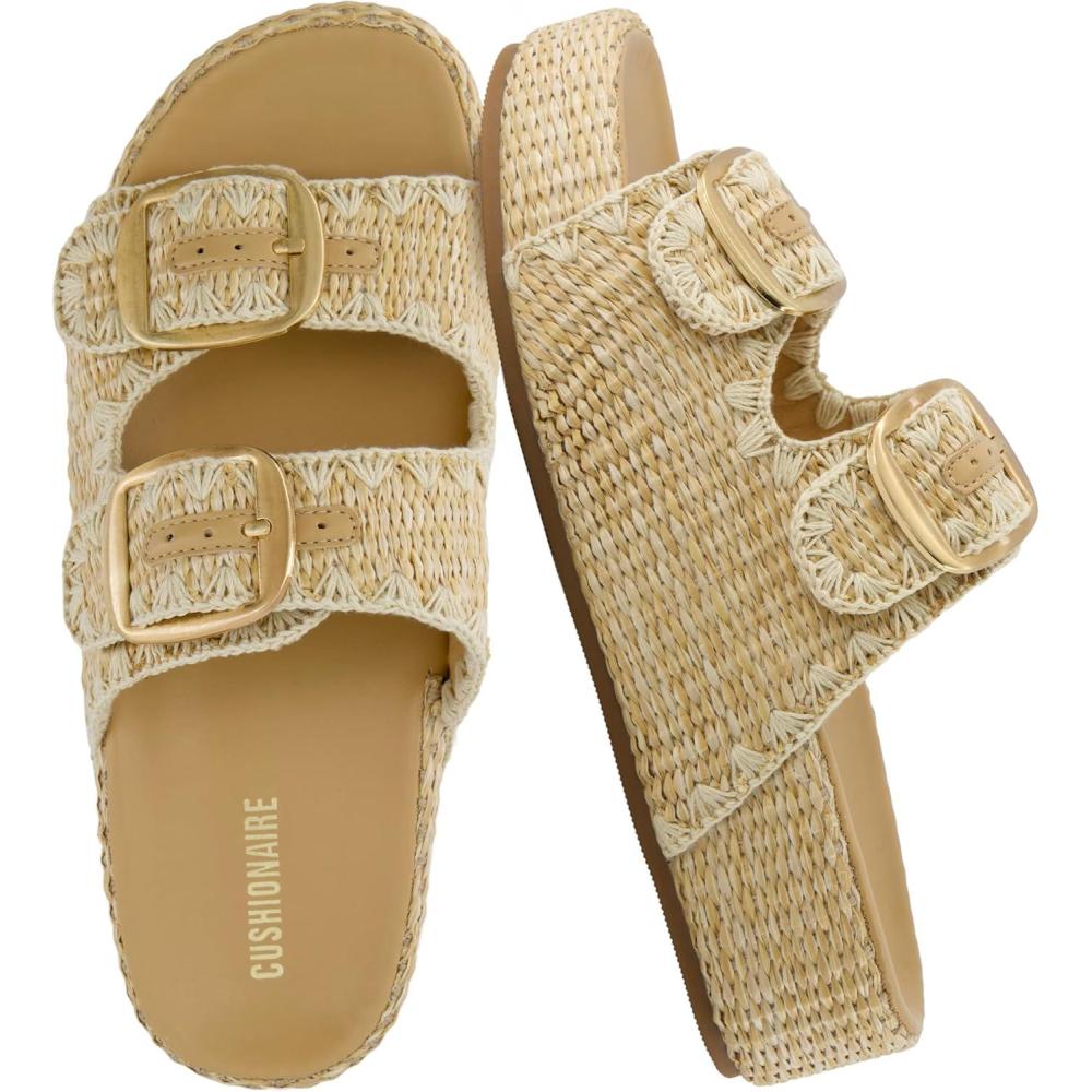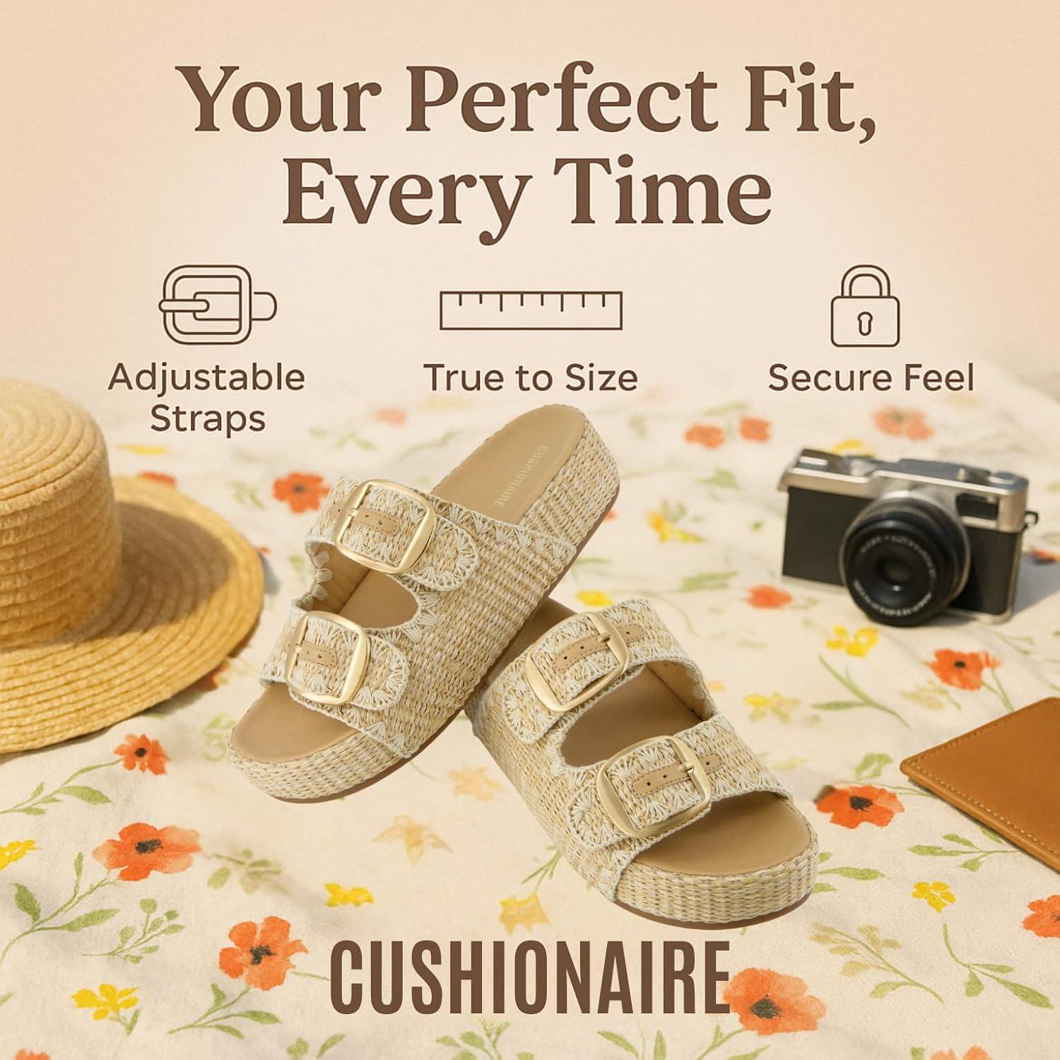 Bring vacation vibes to every step with these CUSHIONAIRE Panama womens platform sandals, crafted for effortless summer style and unmatched comfort. Designed with a beautifully woven raffia upper, these sandals for women 2025 blend natural texture with chic detailing, making them the perfect match for breezy sundresses, wide-leg linen pants, or flowy resort wear. Whether you're strolling through cobblestone streets, enjoying brunch on a sunny patio, or heading to a beachfront dinner, these sandals complete your look with relaxed elegance. The dual buckle straps offer a customizable fit while adding a bold, fashion-forward touch. Set on a lightweight platform sole, they provide subtle height with all-day comfort thanks to a plush cushioned footbed that supports your feet from morning to night. The slip-on design ensures easy on-and-off wear—ideal for spontaneous adventures and laid-back luxury. Effortlessly stylish and endlessly versatile, these raffia platform slides are your go-to beach sandals for vacation getaways, weekend escapes, or everyday summer chic.