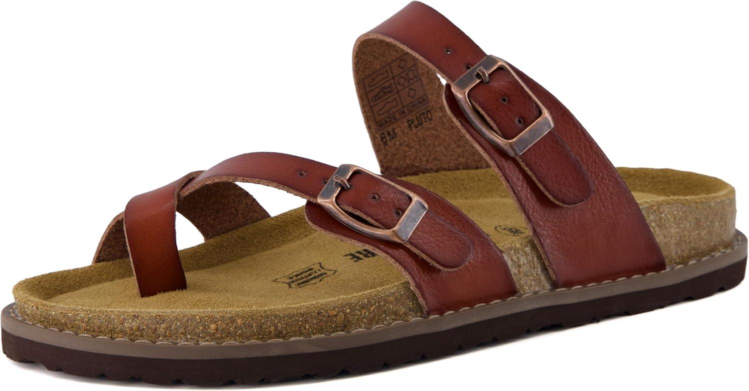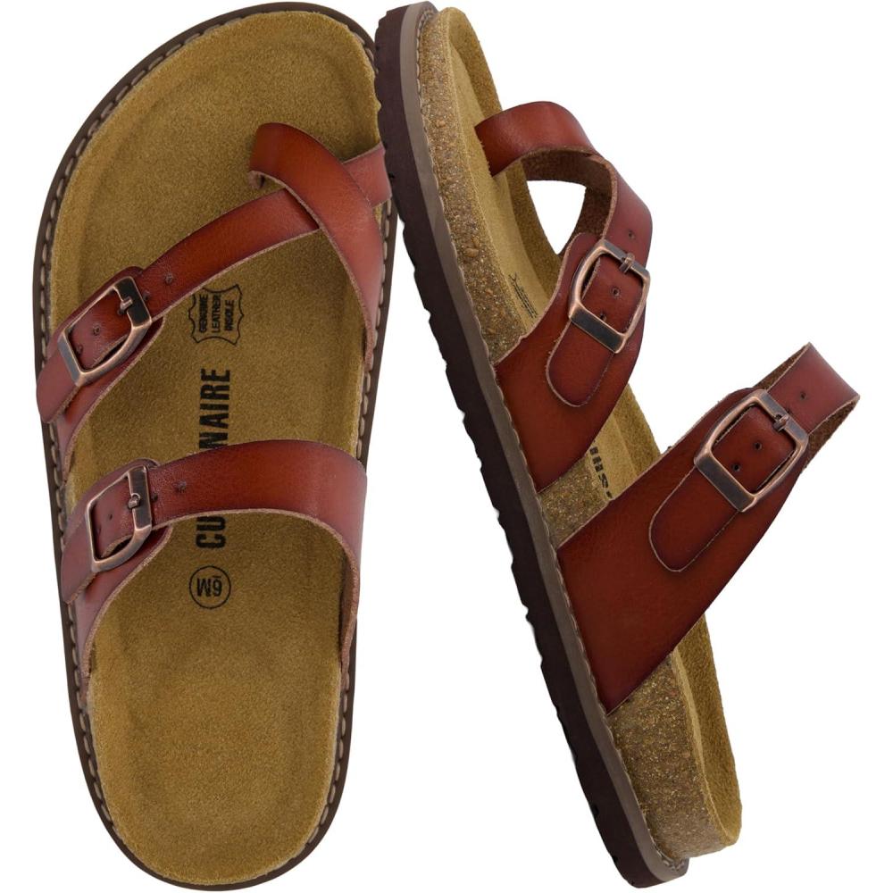 CUSHIONAIRE Pluto Cork Footbed Summer Sandals for Women Comfortable Slides with Adjustable Buckles, Toe Loop & Stitched Design – Stylish Slip On Women Footwear(Whiskey)