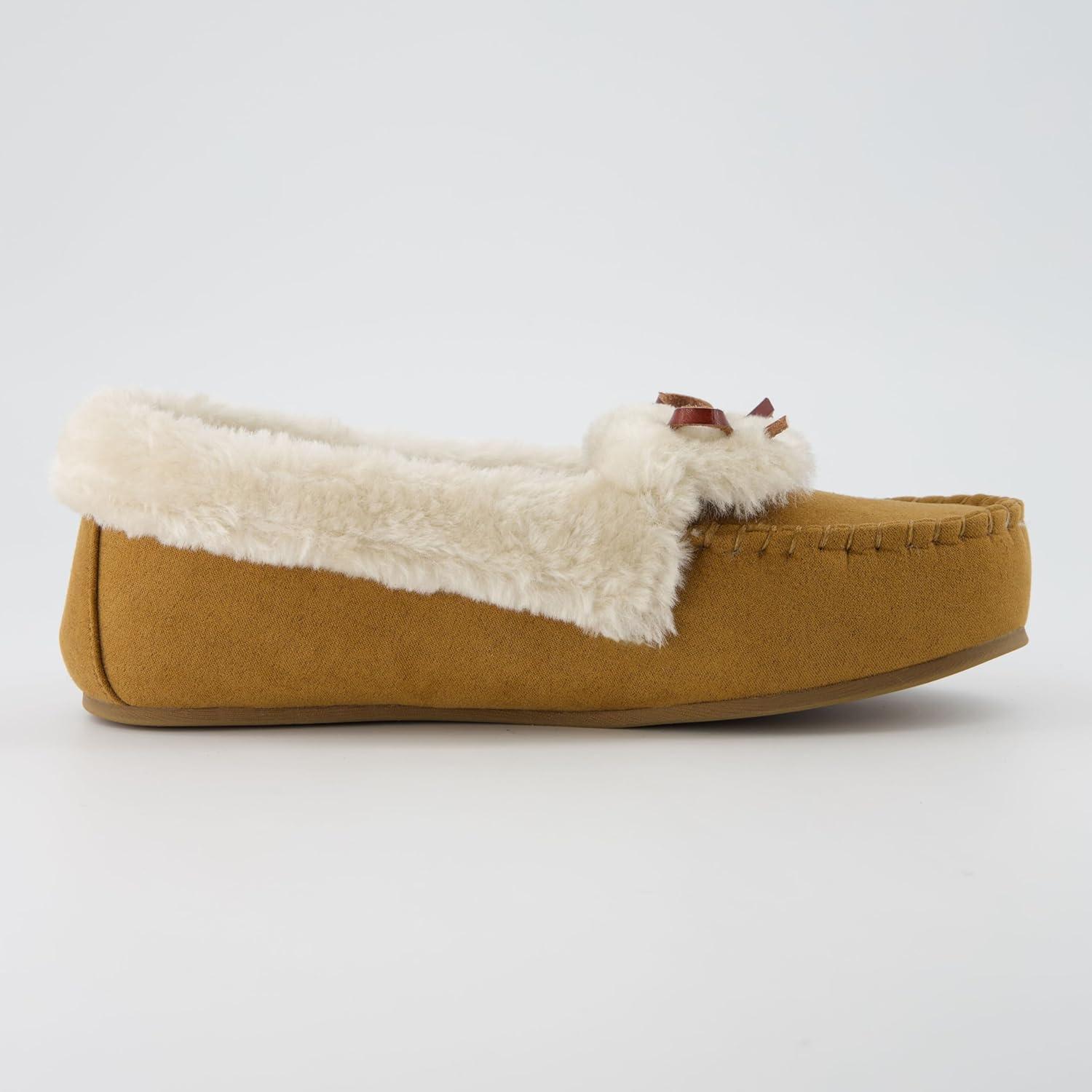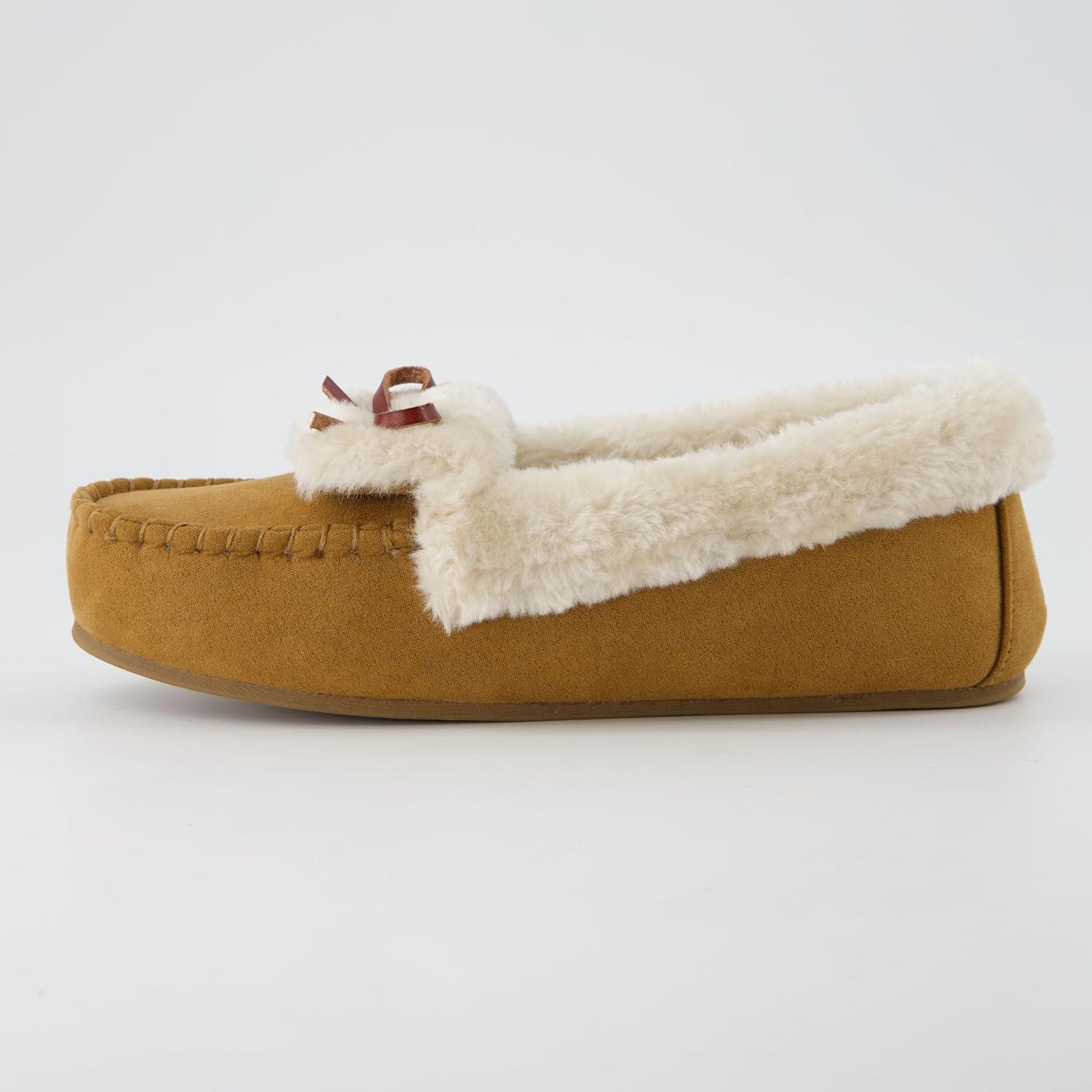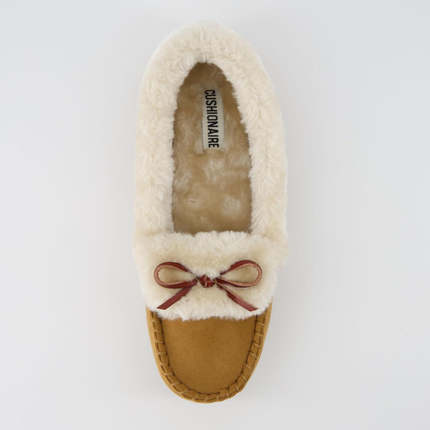 CUSHIONAIRE Stella Women's Moccasin Slippers – Faux Fur Lining, Memory Foam & Wide Widths Available(Chestnut)