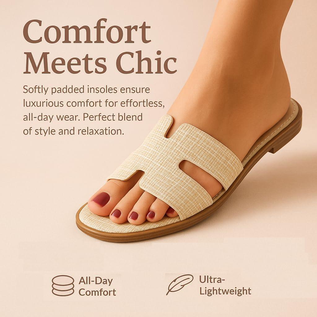 CUSHIONAIRE Voyage Cutout Strap Slides for Women, Slip On Summer Flats, Trendy Footwear, Comfortable Vacation Style Sandals for Women 2025(Cream Woven)