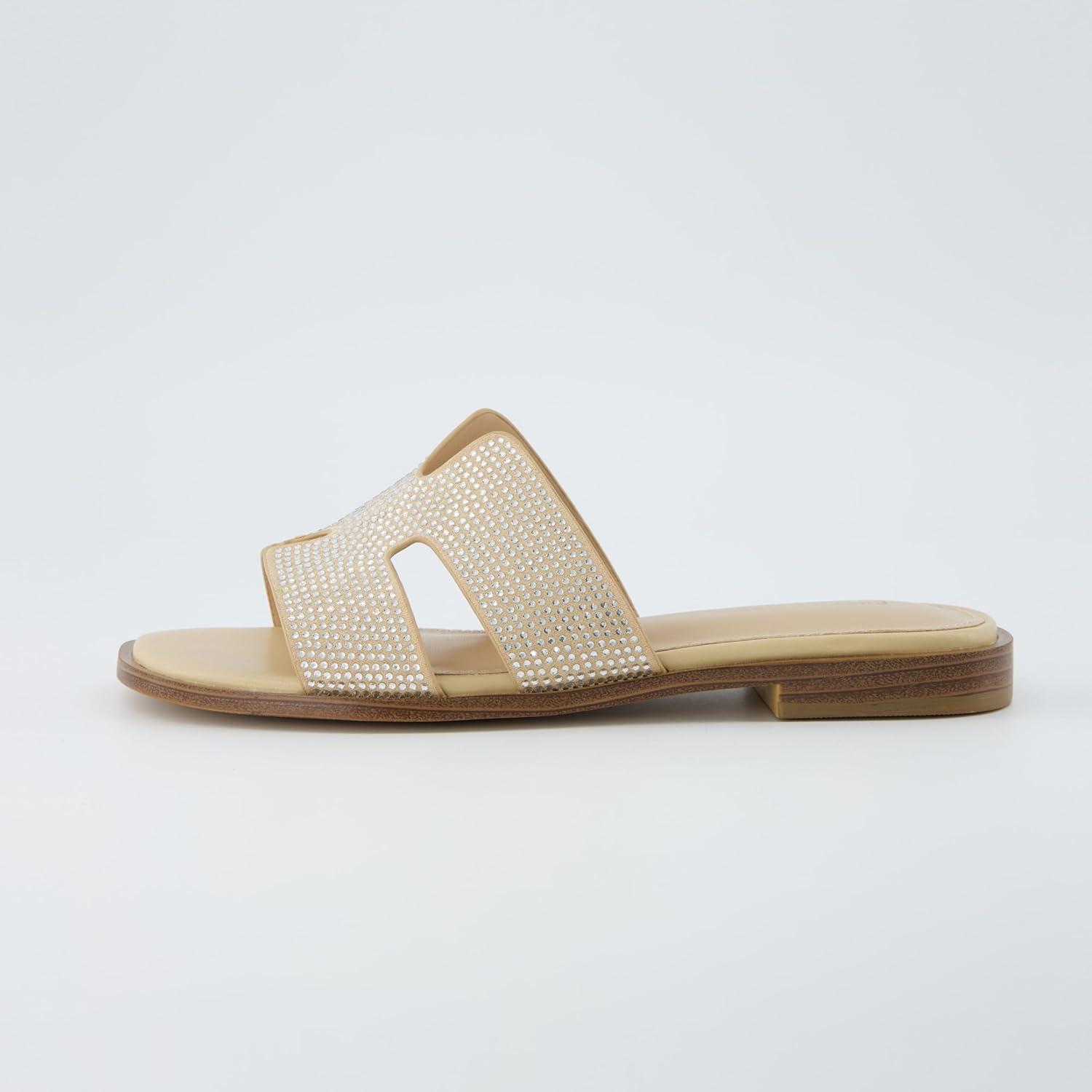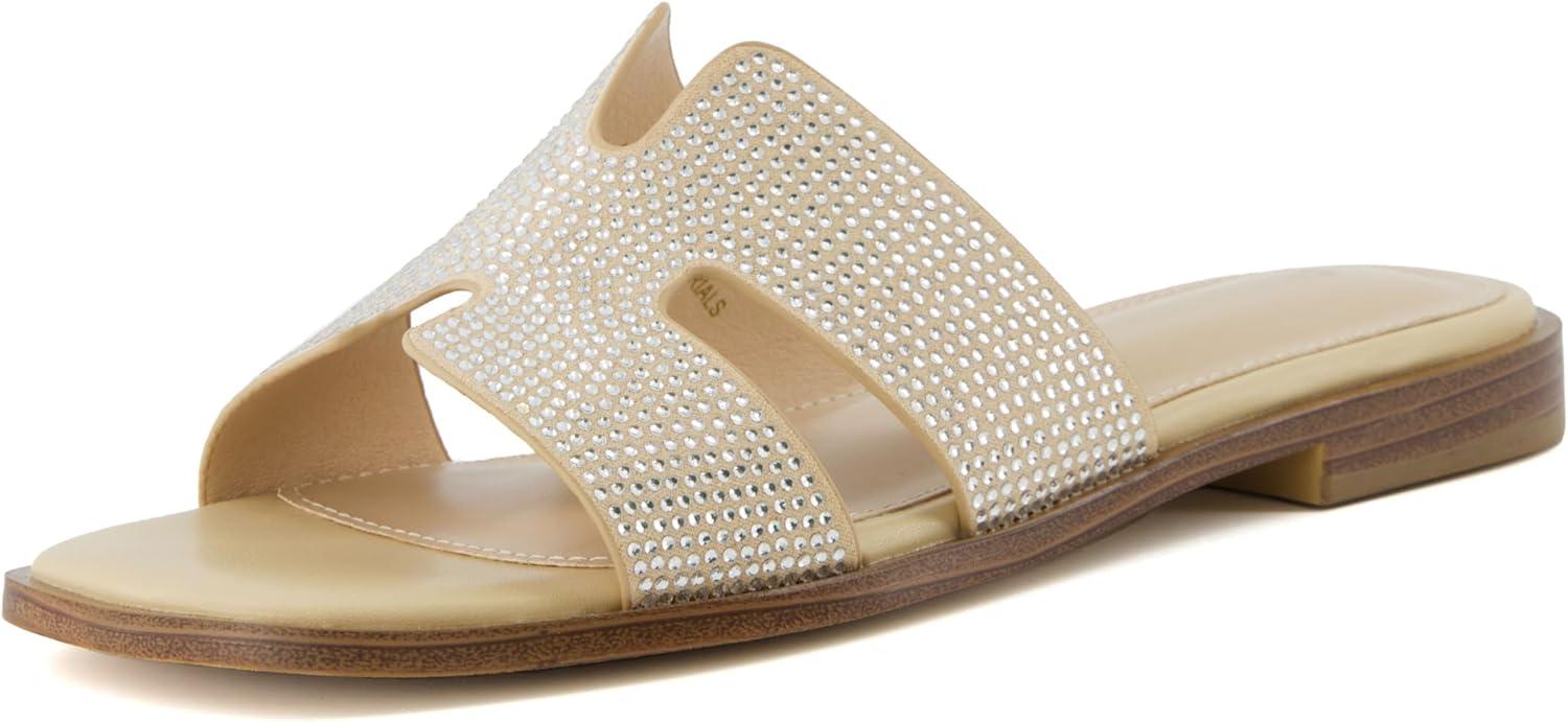 CUSHIONAIRE Voyage Cutout Strap Slides for Women, Slip On Summer Flats, Trendy Footwear, Comfortable Vacation Style Sandals for Women 2025(Embellish Tan)