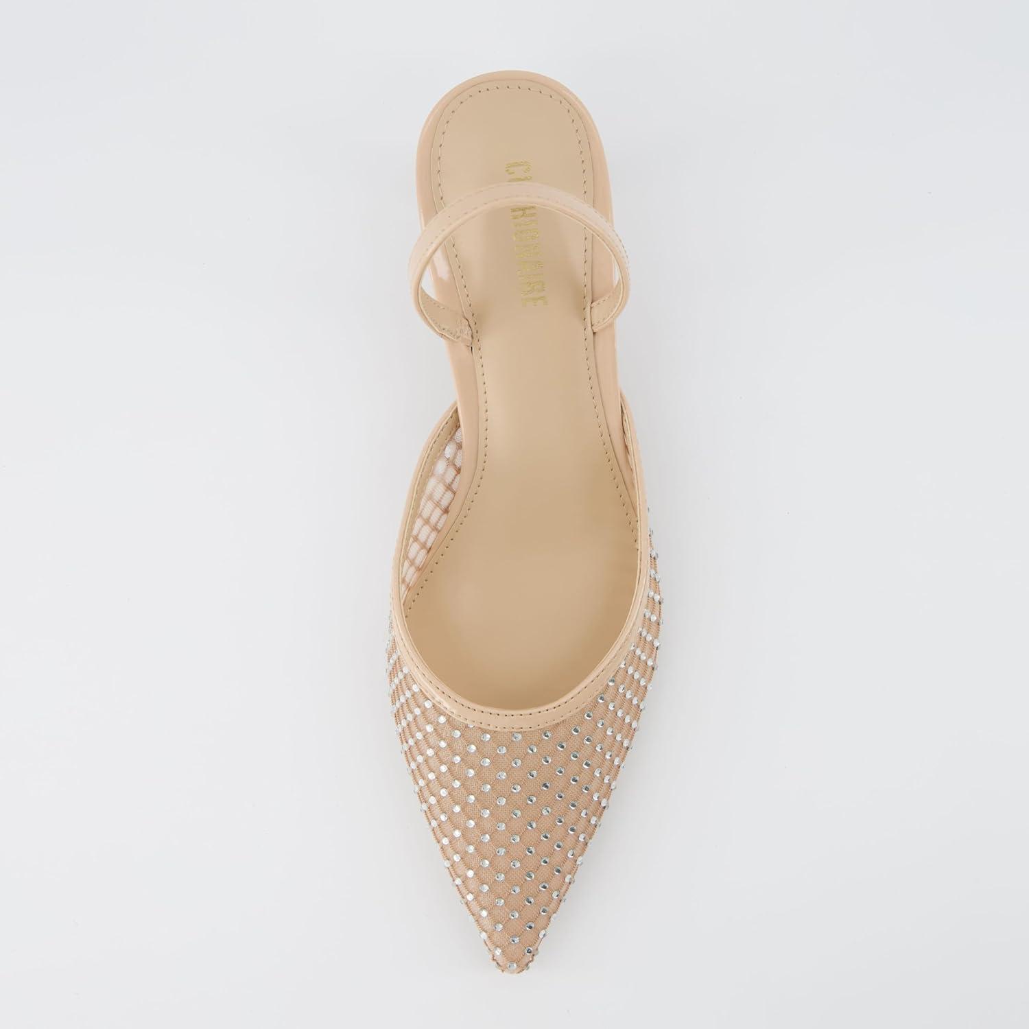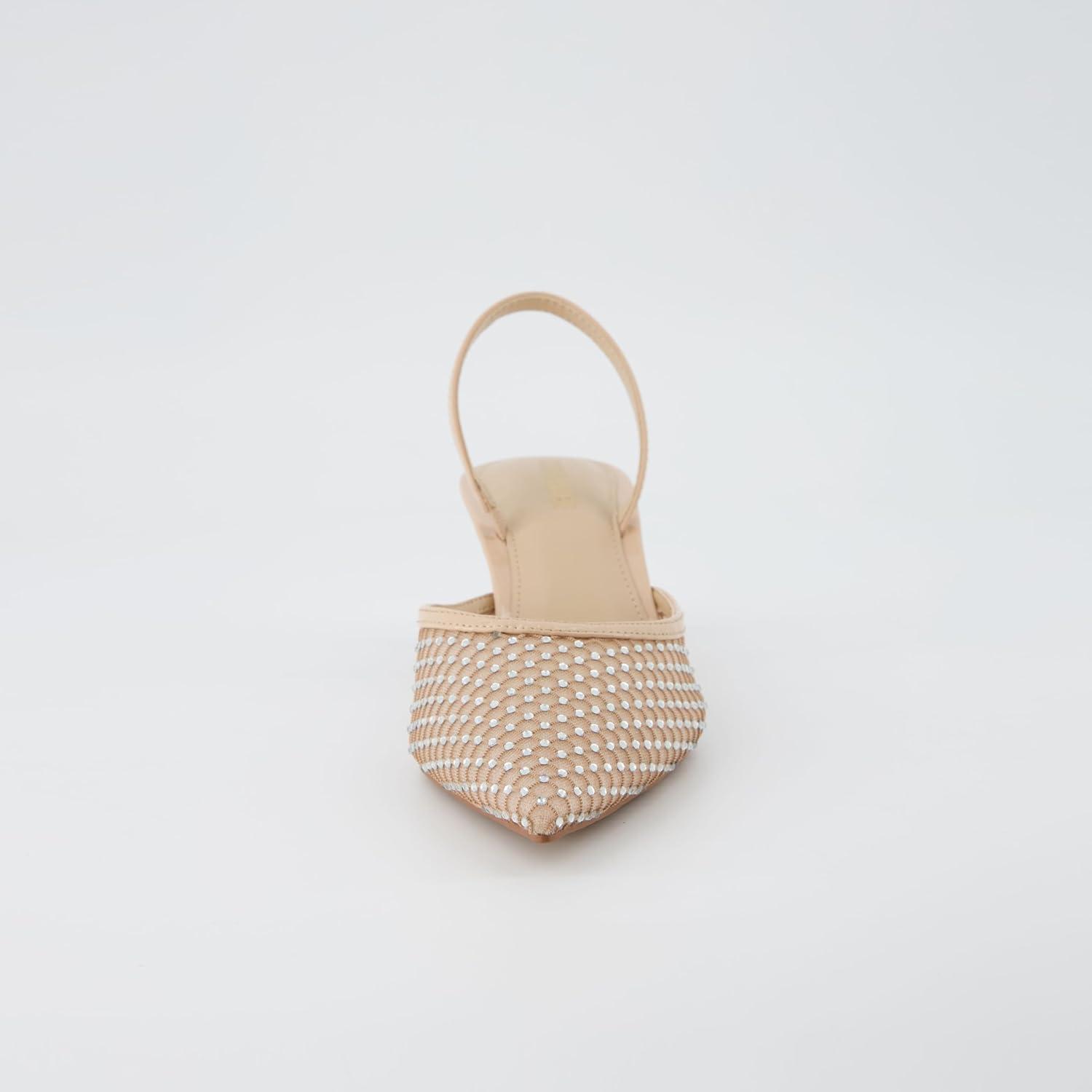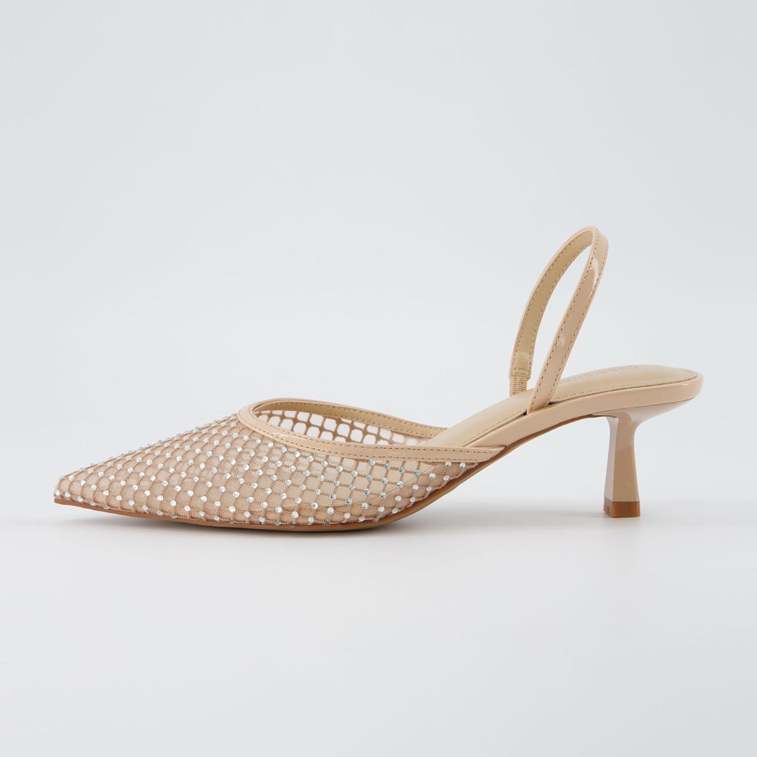 Elevate your look with the Rhinestone Mesh Slingback Heel. These chic heels feature a pointed toe design with a delicate mesh upper embellished with sparkling rhinestones for a glamorous effect. The low kitten heel adds a sophisticated lift, while the slingback strap ensures a comfortable, secure fit. Made with premium vegan materials and cushioned with memory foam insoles, these heels offer style without compromising comfort. Perfect for evening events or special occasions, with wide widths available for an ideal fit.
