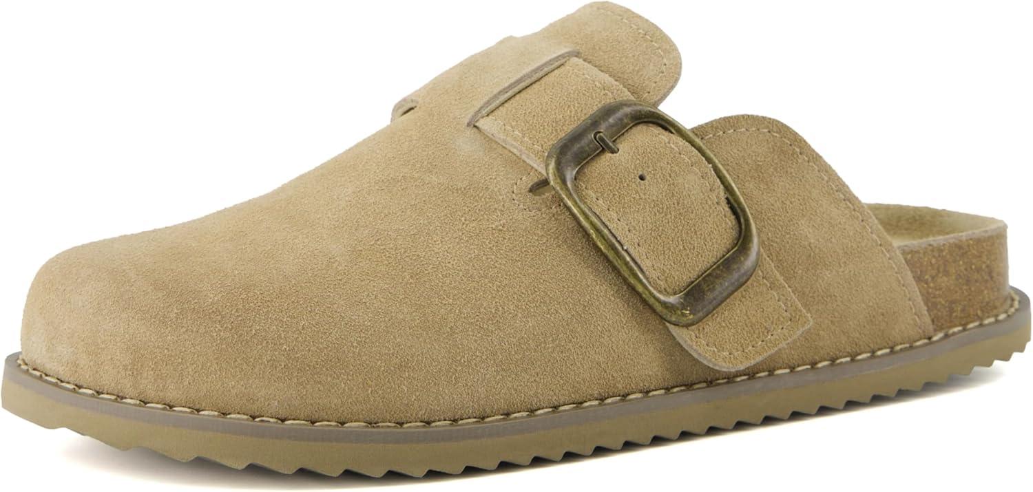 CUSHIONAIRE Women's Blain Genuine Suede Slip-On Clogs with + Memory Foam & Chic Buckle Mule - Comfortable, Non-Slip, Wide Widths Available(Biscuit Suede)