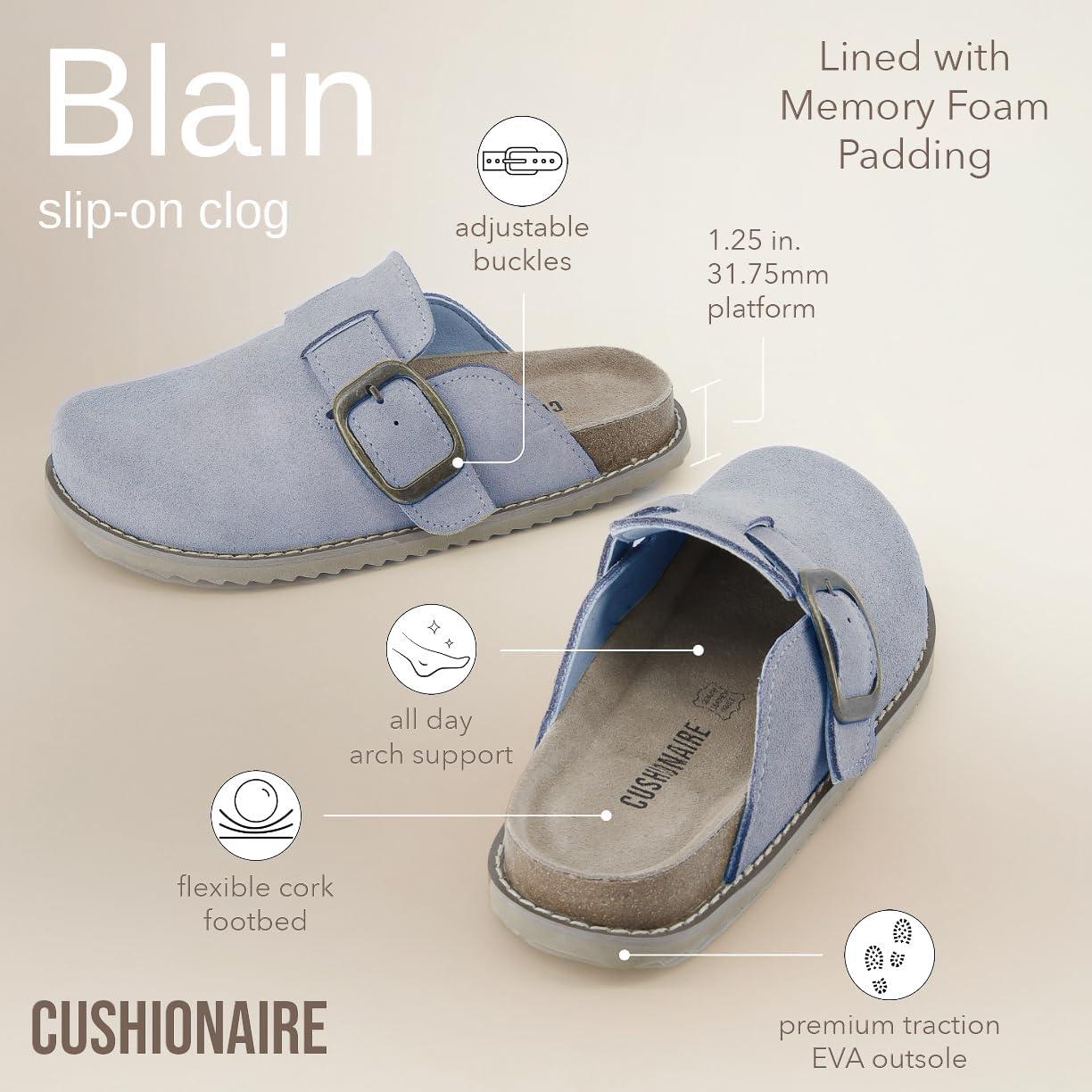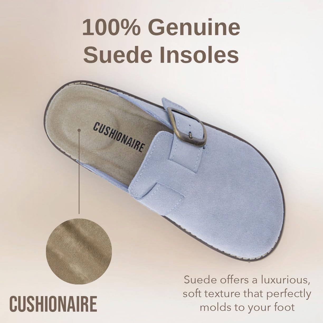 CUSHIONAIRE Women’s Blain Genuine Suede Slip-On Clogs with + Memory Foam & Chic Buckle Mule – Comfortable, Non-Slip, Wide Widths Available(Light Blue)