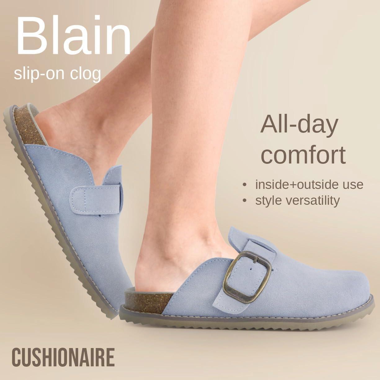 imageCUSHIONAIRE Womens Blain Genuine Suede SlipOn Clogs with  Memory Foam ampamp Chic Buckle Mule  Comfortable NonSlip Wide Widths AvailableLight Blue