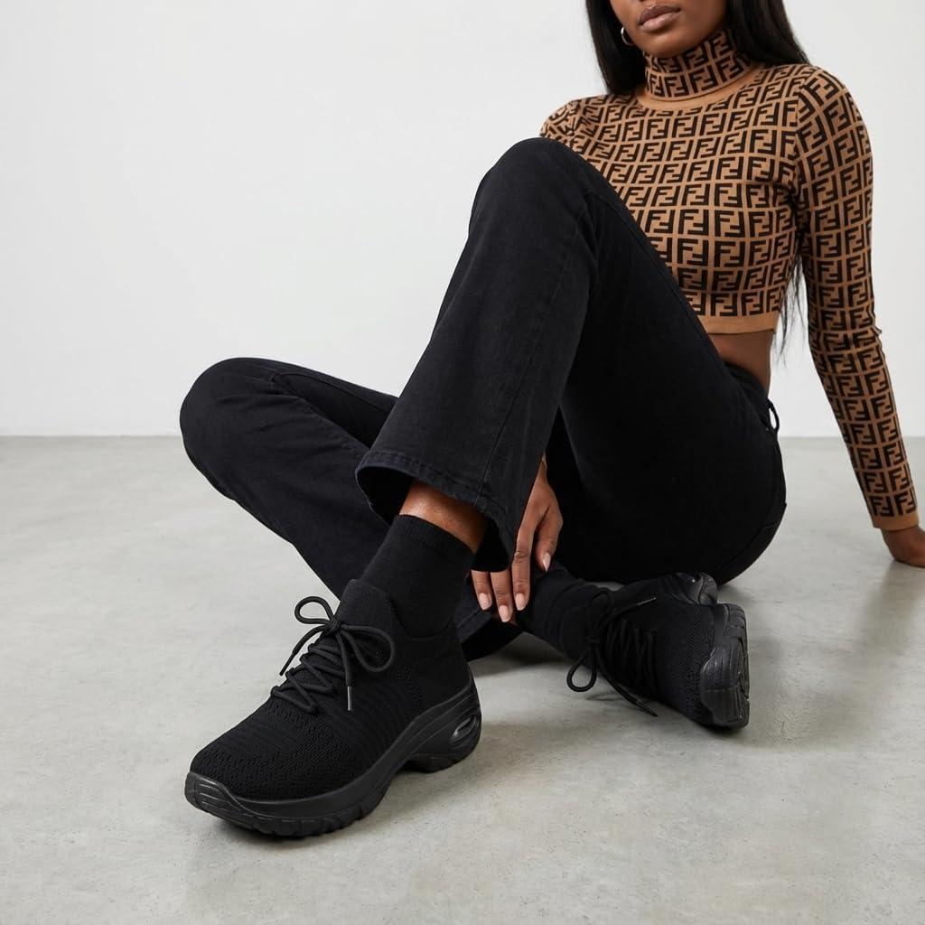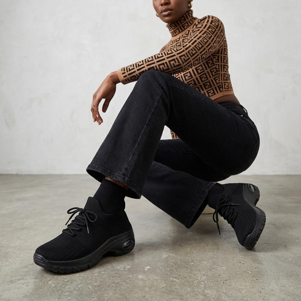 CUSHIONAIRE Women’s Blaze Stretch Knit Slip on lace Sneaker +Memory Foam & LiteSole Technology(Black/Black)