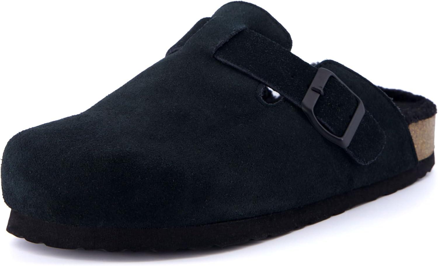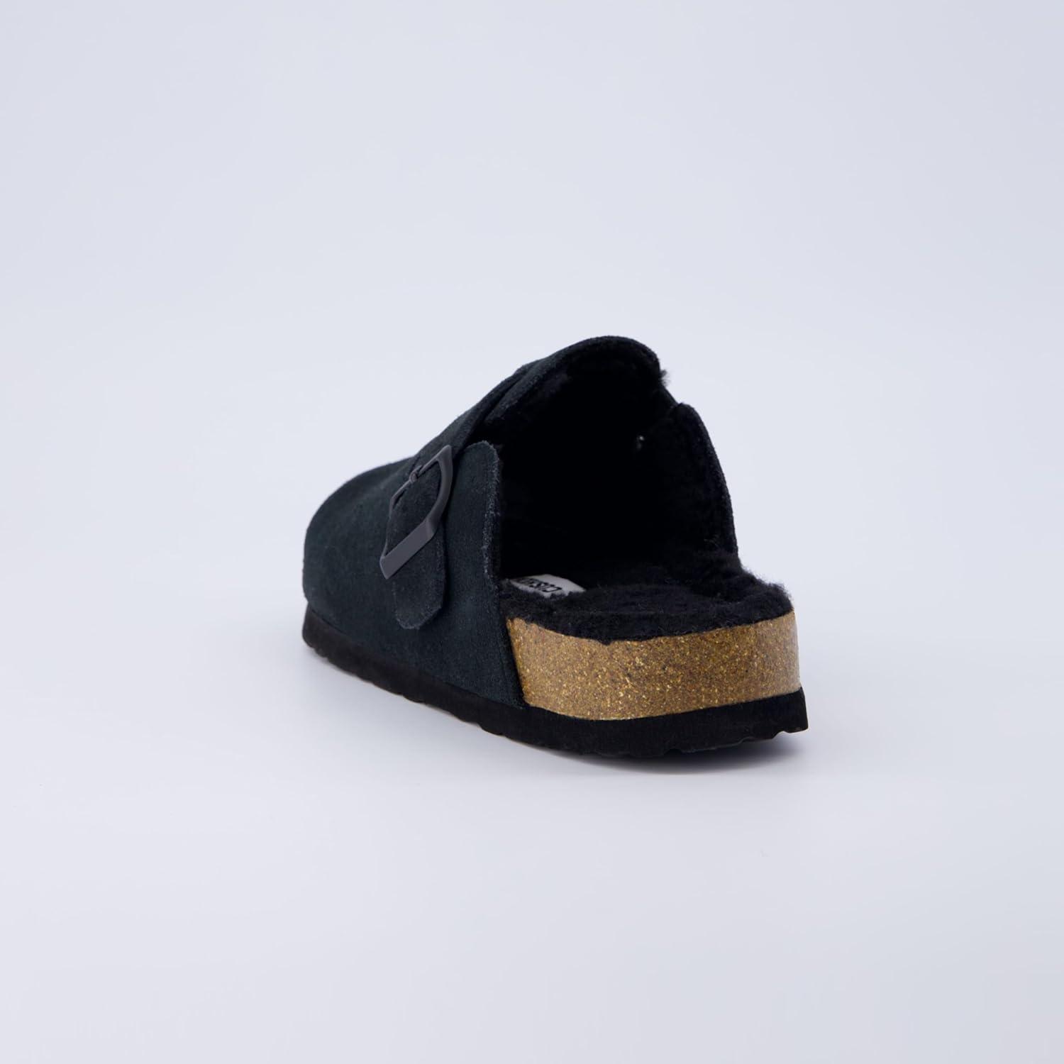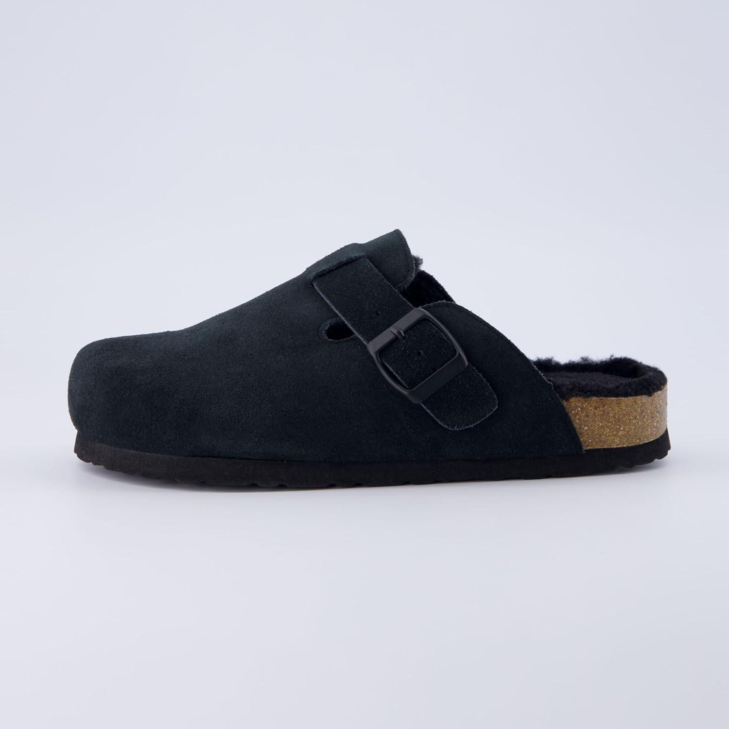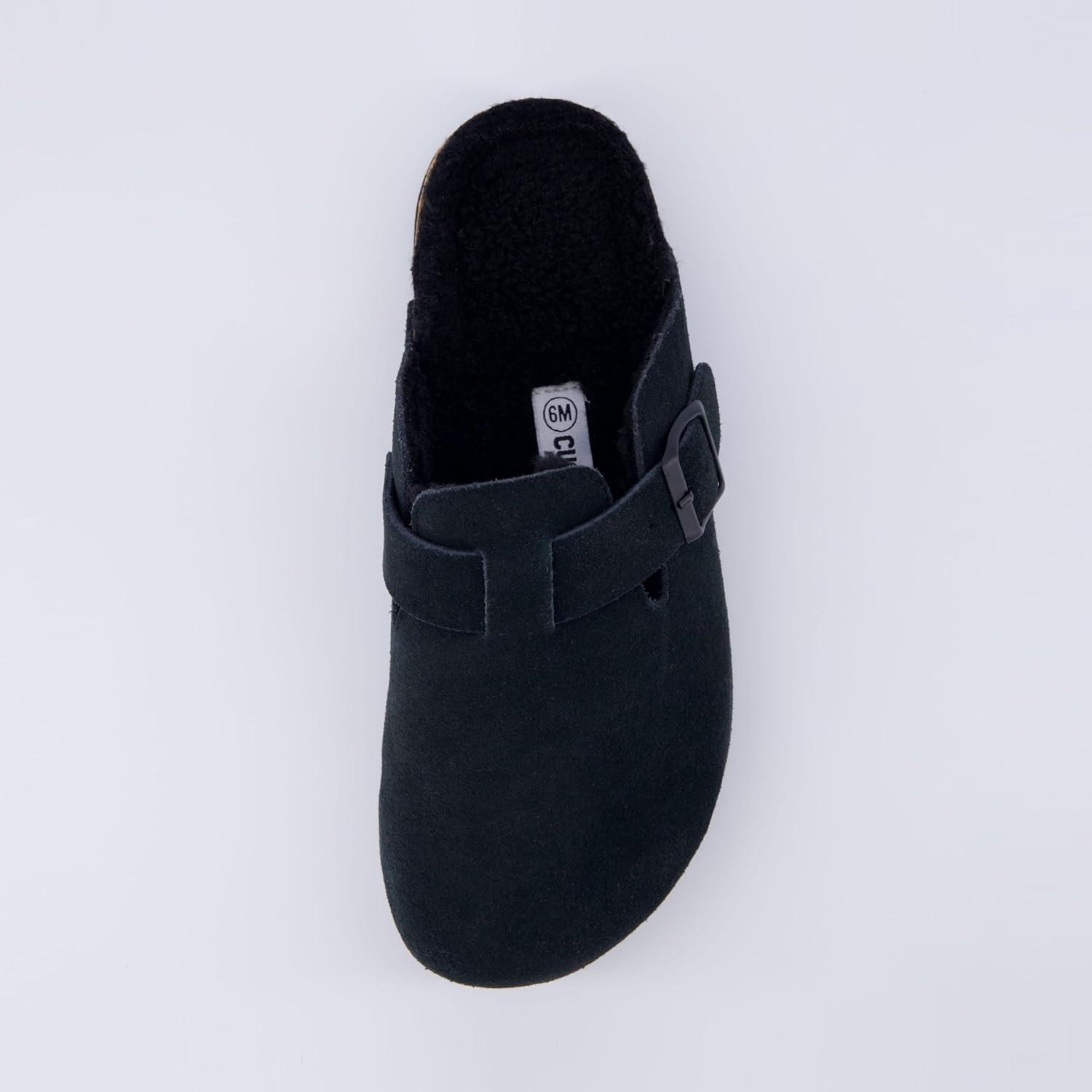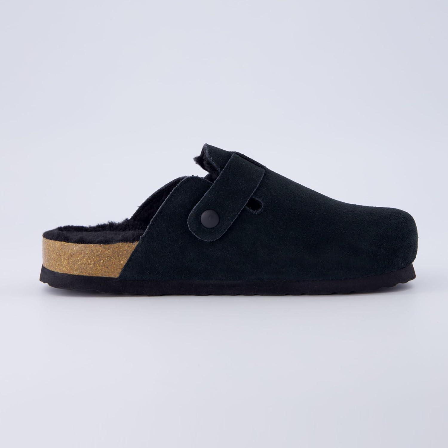 CUSHIONAIRE Women’s Hana Cork footbed clog with Genuine Leather upper, Faux Fur lining, and +Comfort(Black)