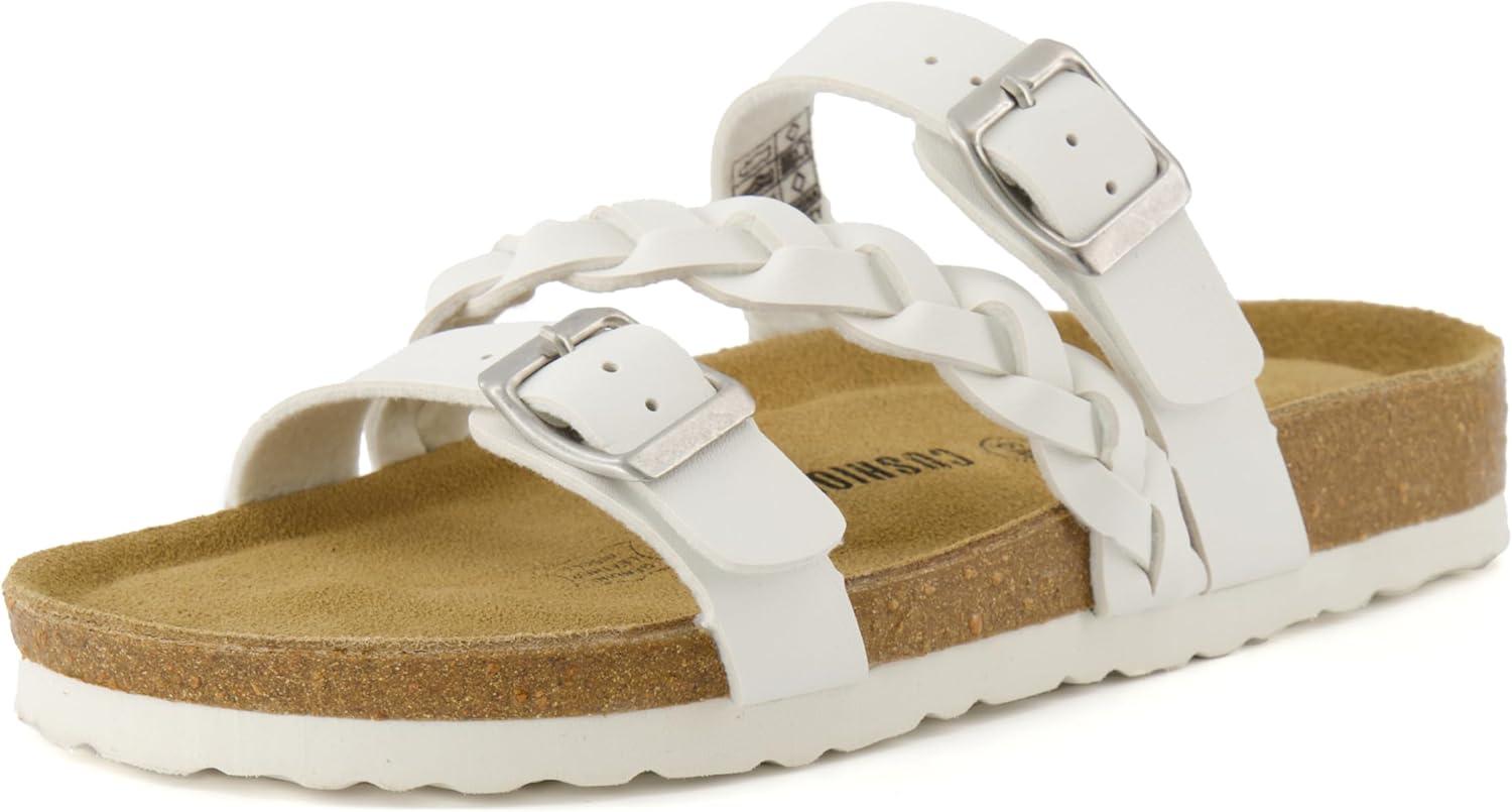 CUSHIONAIRE Women’s Lizzy Cork Footbed Sandal – Comfortable, Adjustable Straps, Arch Support, Wide Widths Available, Boho Chic Summer Slides(White)
