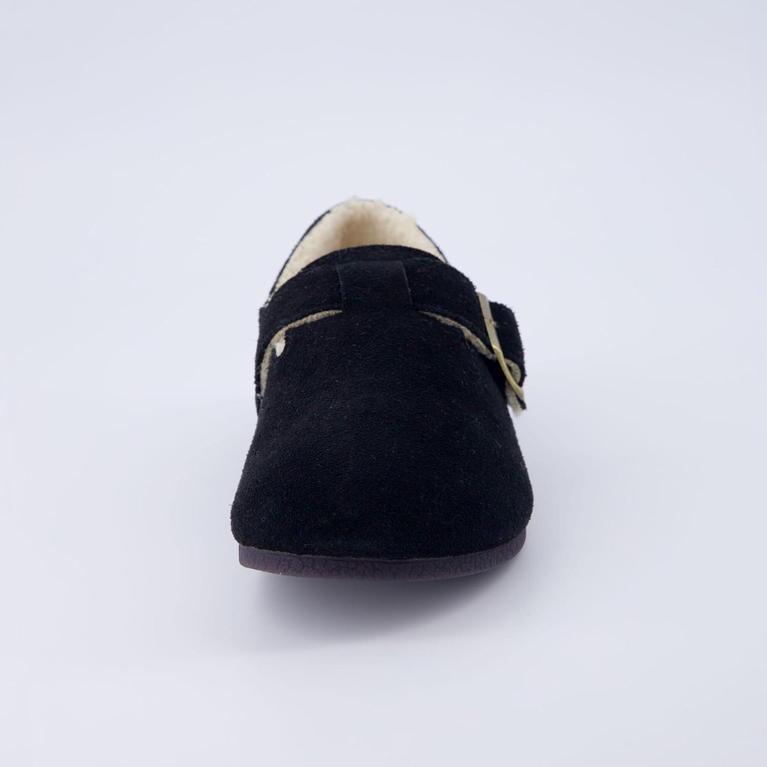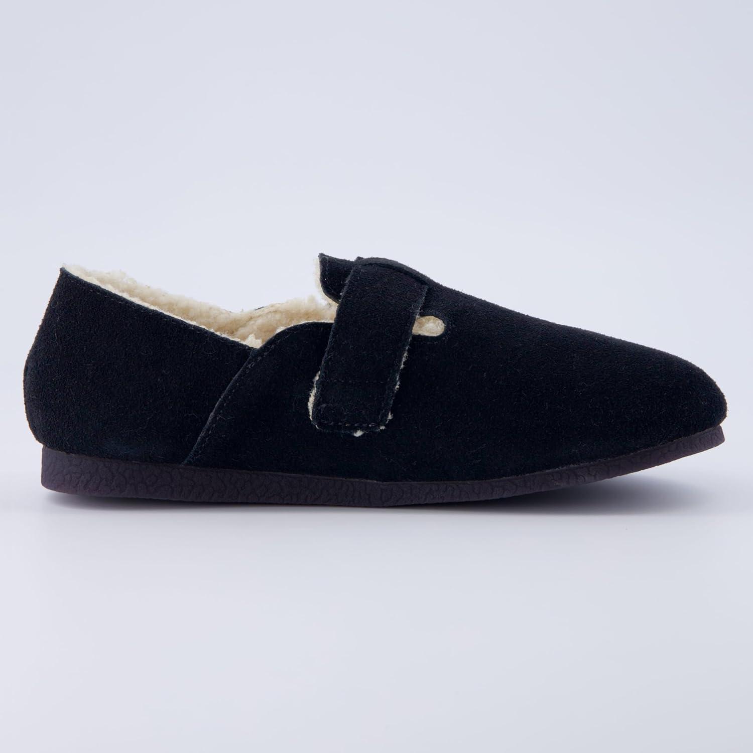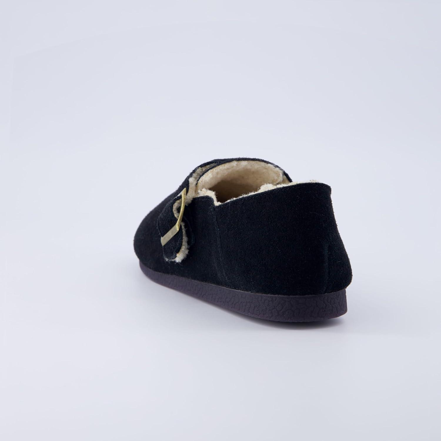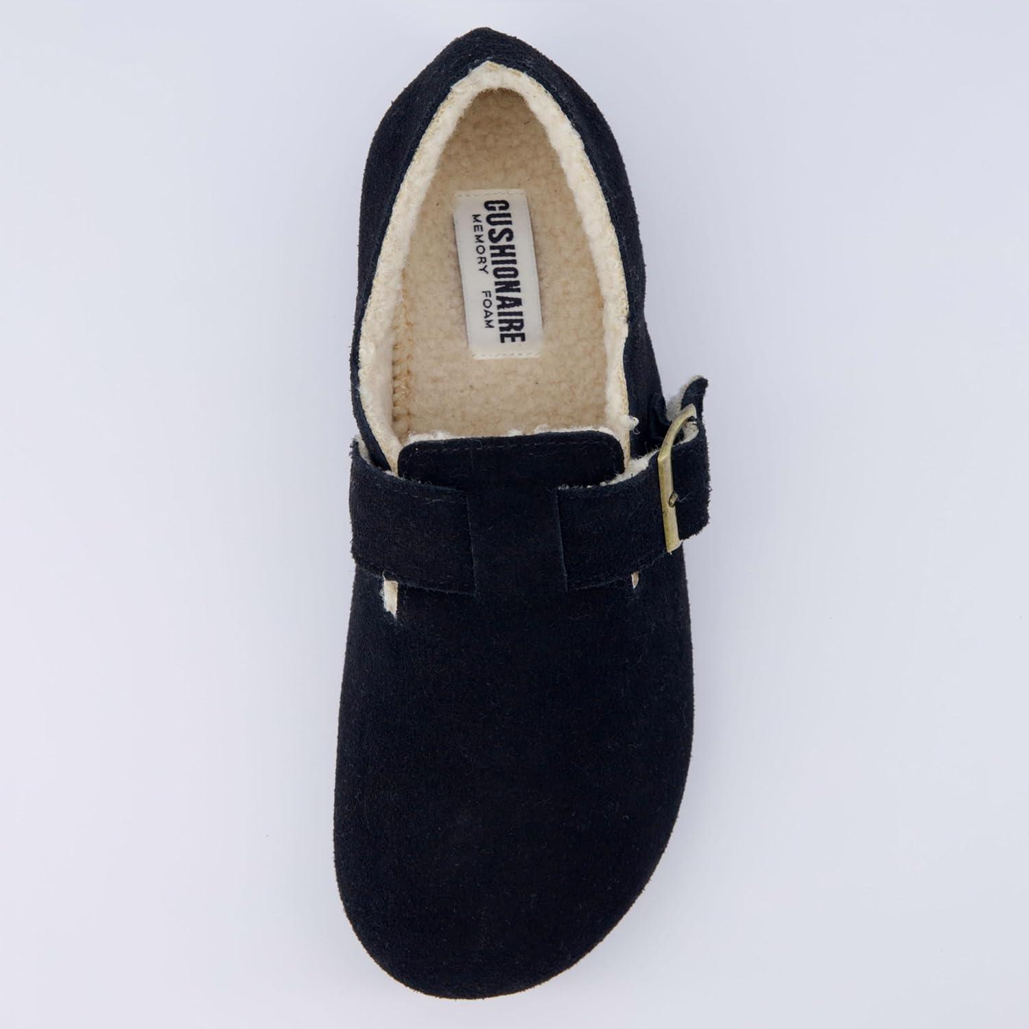 CUSHIONAIRE Women's Nest Genuine Suede Slip-On Shoe with Faux Shearling Lining & Memory Foam | Adjustable Buckle & Non-Slip Sole(Black)