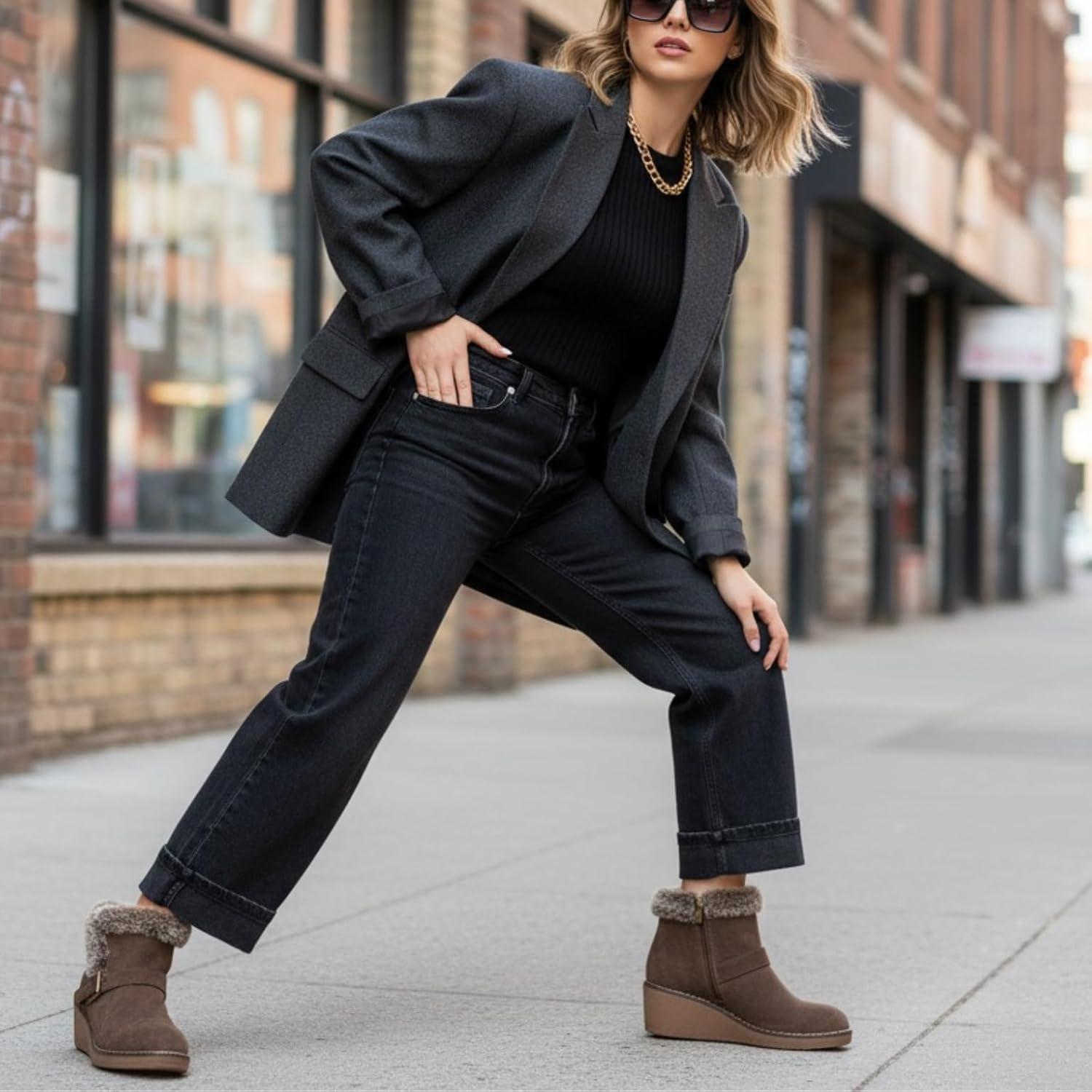 CUSHIONAIRE Women’s Rhodes Faux Suede Winter Booties – Fur Boots for Women with Memory Foam, Comfy Boots with Faux Fur, Side Zipper, 2-Inch Wedge Heel, Wide Widths Available(Black)