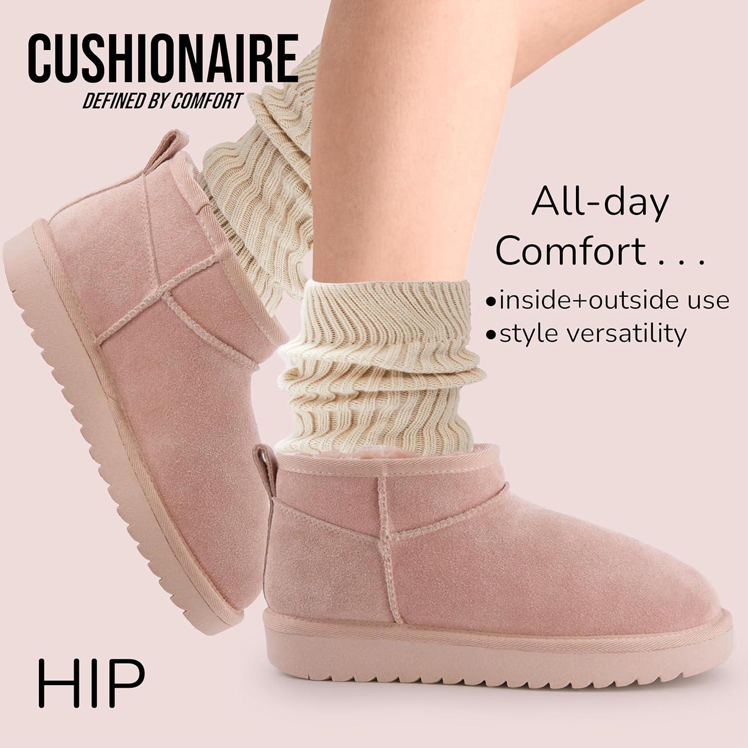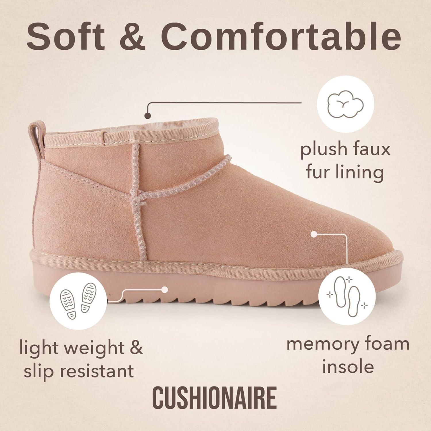 Step into warmth, comfort, and style with the CUSHIONAIRE Women's Hip 2 Genuine Suede Ankle Snow Boots. Crafted from premium, high-quality suede, these boots are designed to keep your feet cozy and protected during cold weather. Customers love the comfortable fit and plush faux fur lining, which provide a soft, luxurious feel from the moment you slip them on. Whether you're braving chilly outdoor conditions in Fall, Winter or lounging indoors, these boots offer the perfect blend of comfort and warmth. Featuring a water-resistant upper, these snow boots help shield your feet from light rain and snow, keeping you dry and comfortable throughout the day. The memory foam insole ensures all-day cushioning, adapting to your foot for personalized support, while the non-slip rubber outsole provides reliable traction on slippery surfaces. With their easy slip-on design and 3.25-inch ankle height, these boots are not only practical but also versatile enough for various occasions—whether you're running errands or meeting friends for a casual outing.